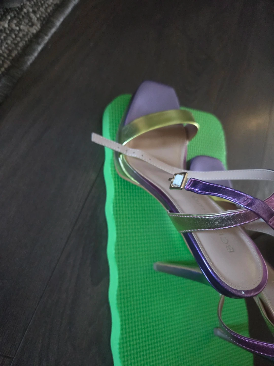 These BCBGeneration heeled sandals feature a stylish metallic multi-colour design. They have an ankle strap with buckle closure for a secure fit. Perfect for dressing up any outfit!