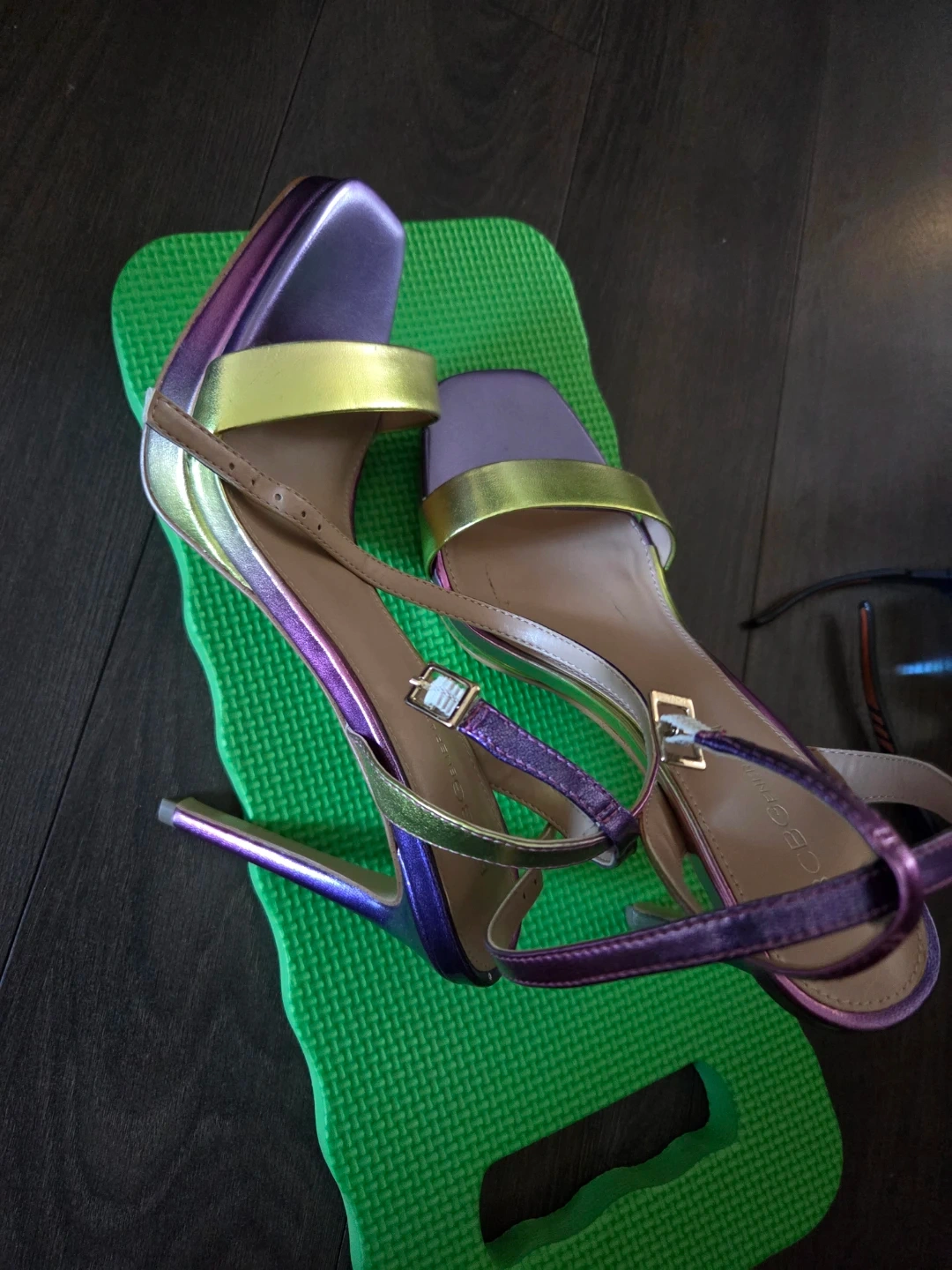 These BCBGeneration heeled sandals feature a stylish metallic multi-colour design. They have an ankle strap with buckle closure for a secure fit. Perfect for dressing up any outfit!