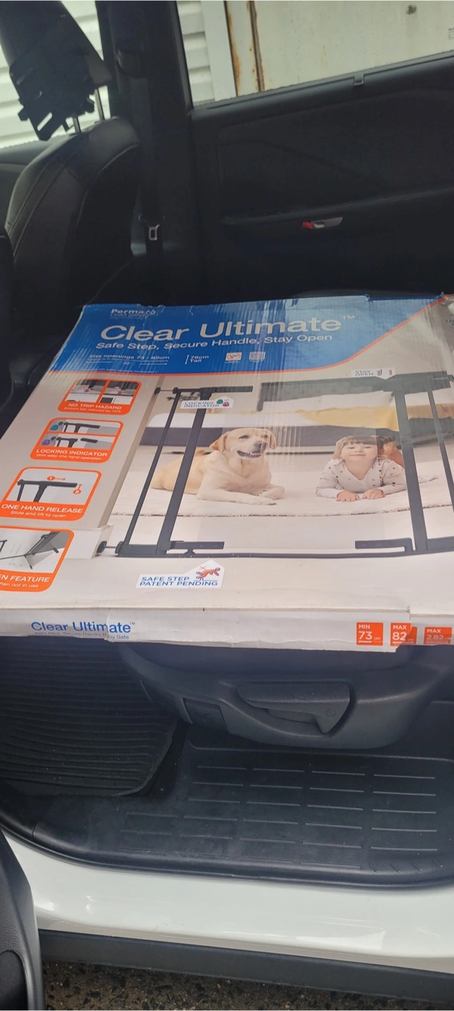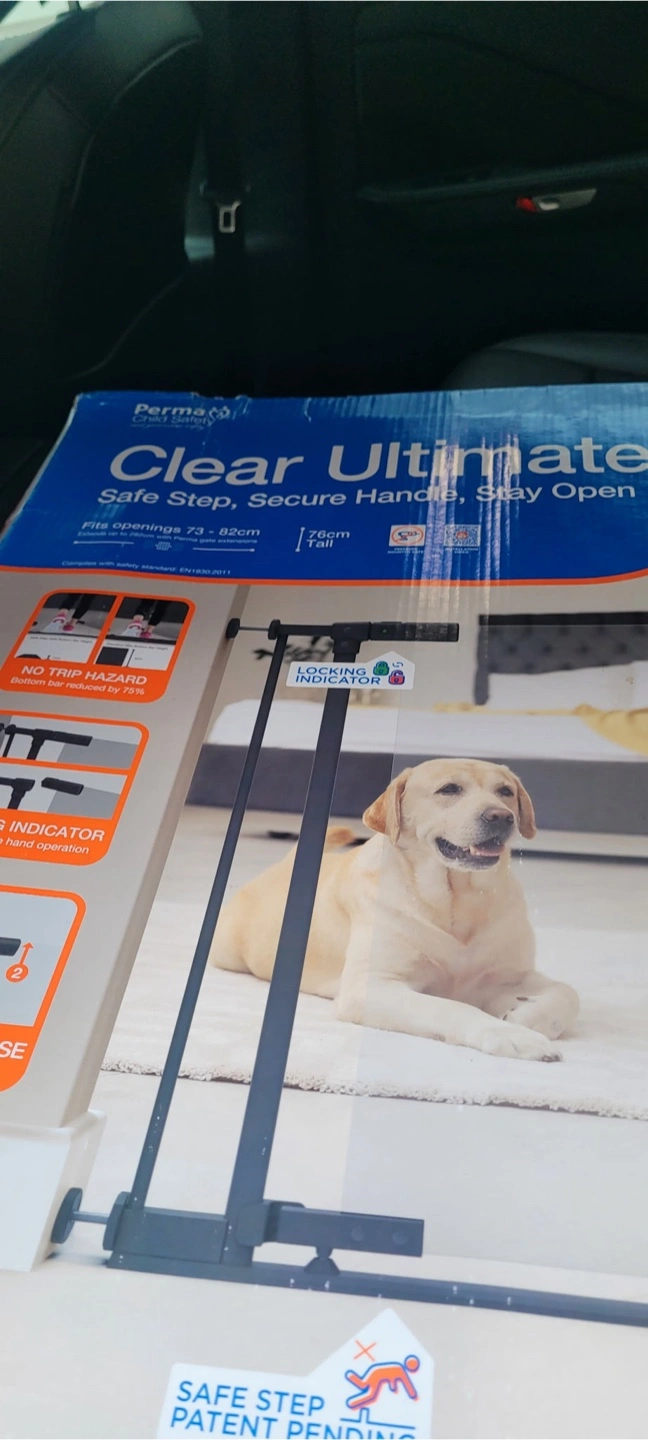 Selling a Perma Child Safety Clear Ultimate baby gate. The box says it's a safe step, secure handle, and stays open.