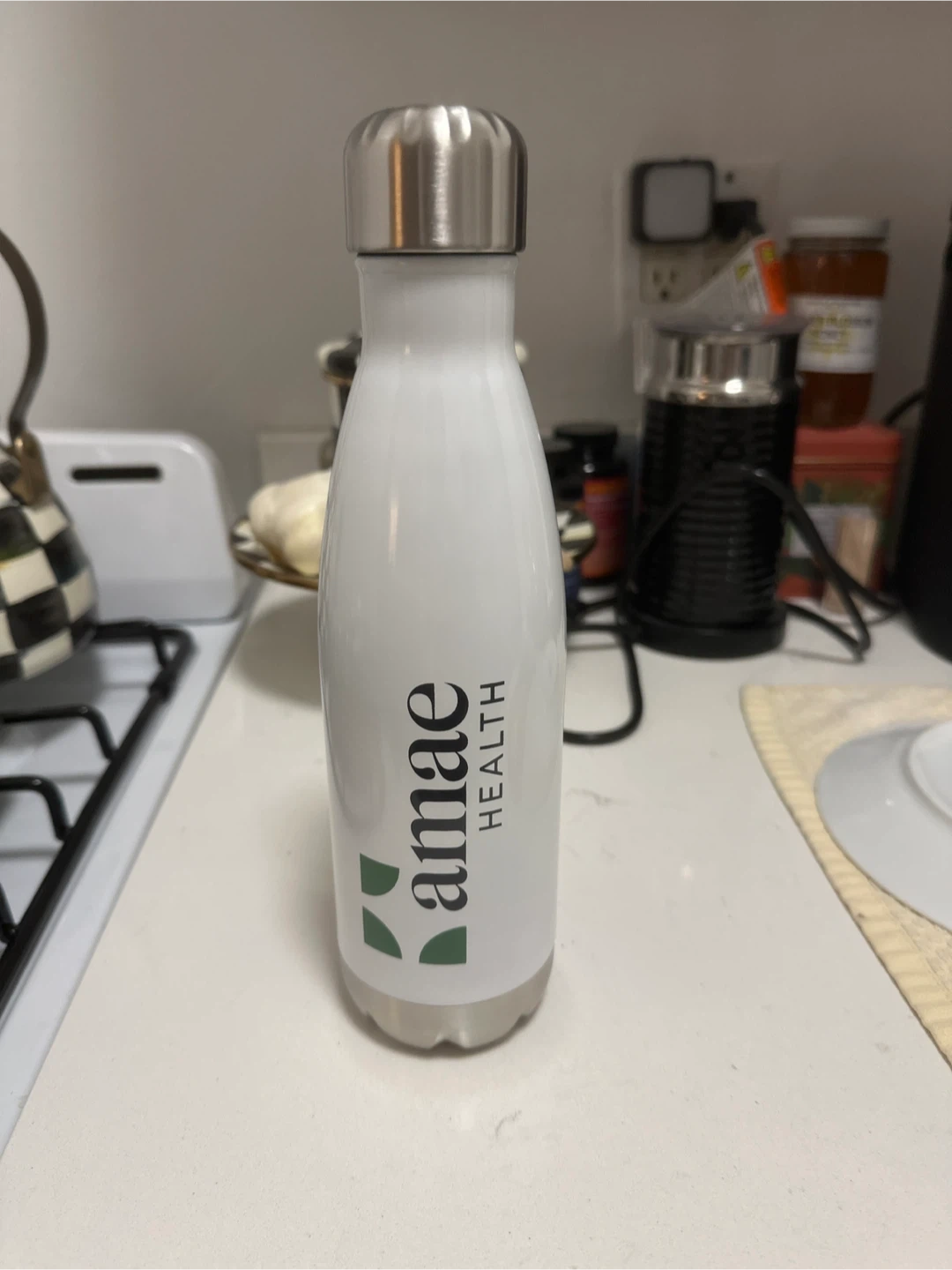 Stay hydrated with this 17 oz Amaë Health stainless steel water bottle. It's white with a silver cap and base. Perfect for carrying your favorite beverages on the go!
