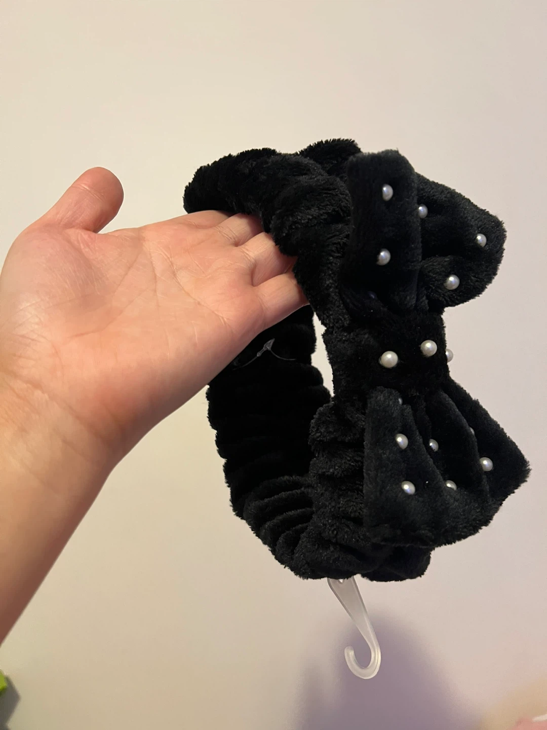 This black headband is made of soft fuzzy material and features a cute bow adorned with pearls. It's designed for comfort and style. This headband is perfect for keeping hair in place during skincare routines or for a fashionable everyday accessory.