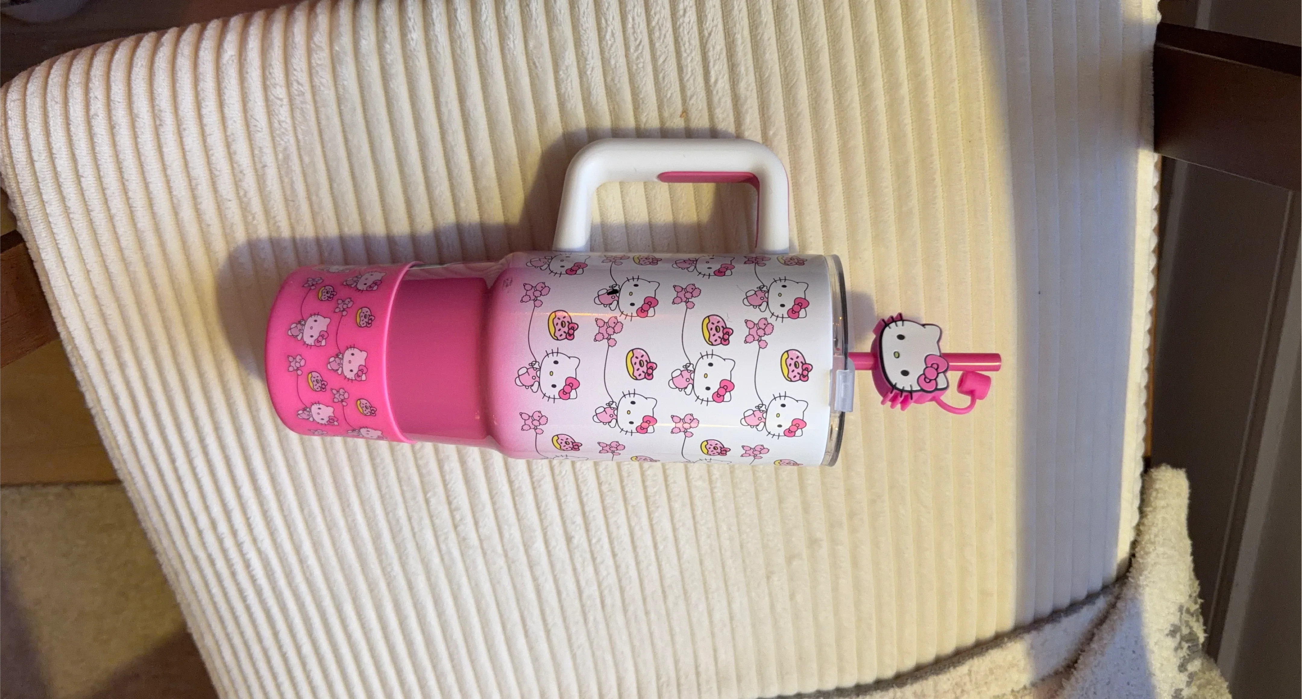 This is a cute Hello Kitty tumbler with a convenient handle and a matching straw. It features an all-over pattern of Hello Kitty characters and flowers.