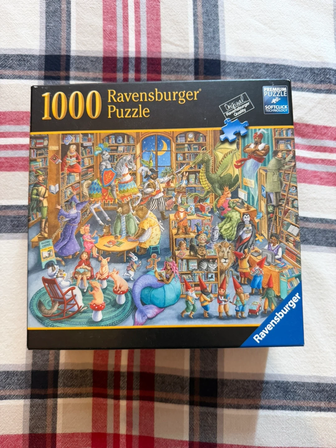This is a 1000-piece Ravensburger puzzle titled "Midnight at the Library". It's made with softclick technology for a perfect interlocking fit. Dimensions are approx. 27 x 20 inches (70 x 50 cm). includes all pieces.