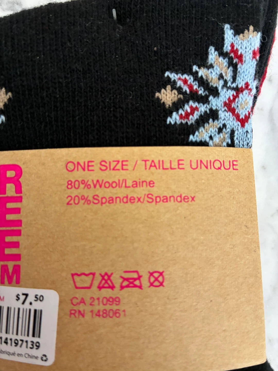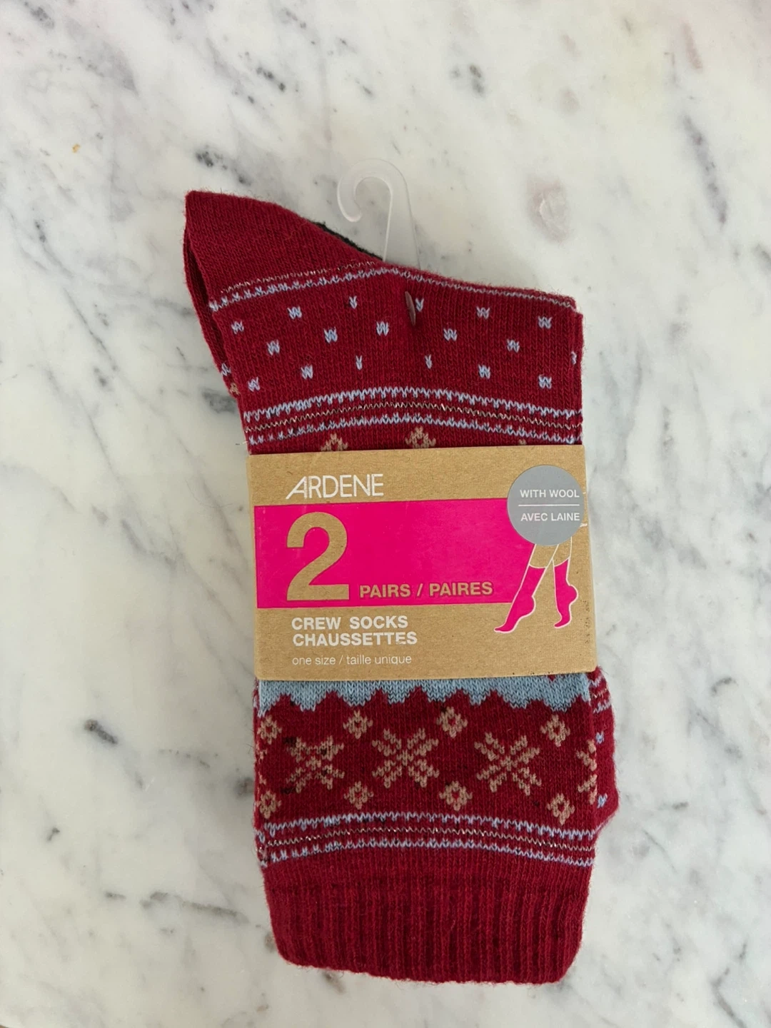 NEW crew socks come in a 2-pair pack, featuring a wool blend for warmth. They're one size fits most. Made with 80% wool and 20% spandex for comfort and stretch.