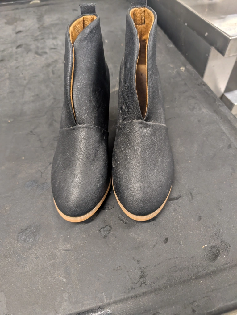 These stylish black ankle boots feature a comfortable block heel and a unique V-shaped opening. The sole is marked with size 39. They're made from a faux leather material.