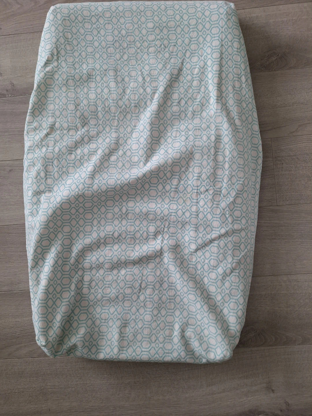 A soft, fitted changing pad cover in a light blue and white geometric pattern. It's made of a stretchy fabric for a snug fit. Machine washable and breathable material.