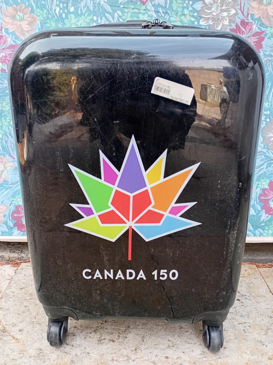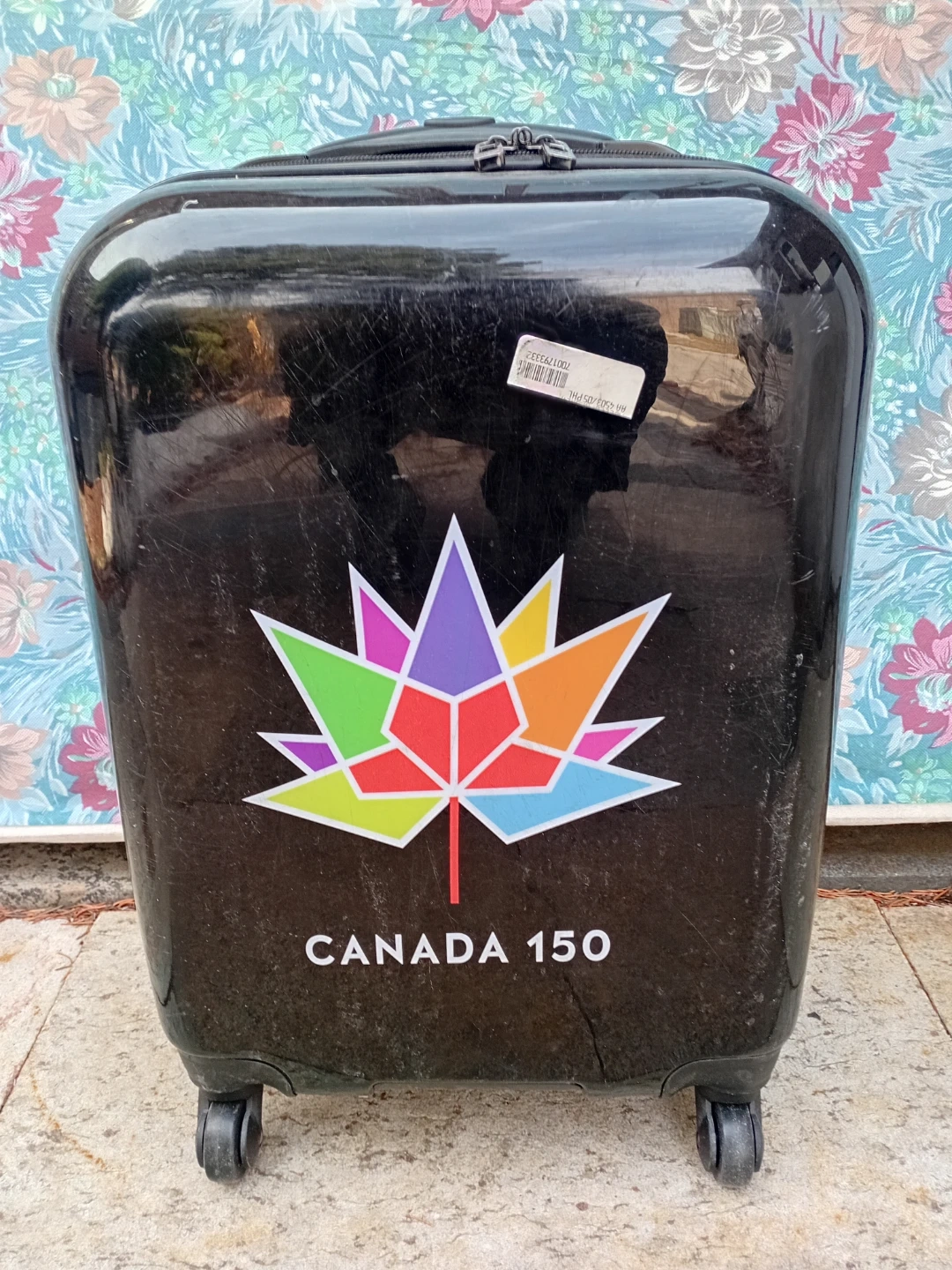 Black rolling suitcase with a colourful maple leaf design and "CANADA 150" text. It's a great piece for travel enthusiasts celebrating Canada's 150th anniversary. Four spinner wheels for easy manoeuvring.