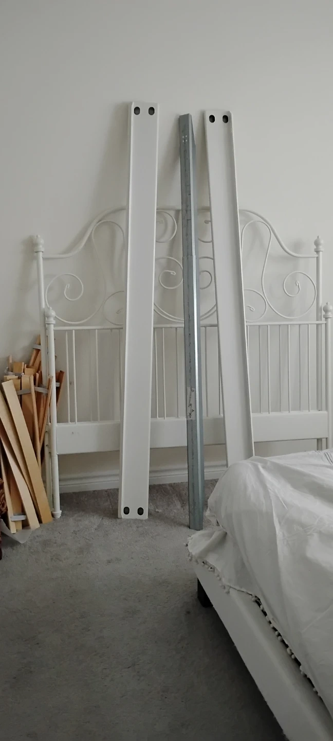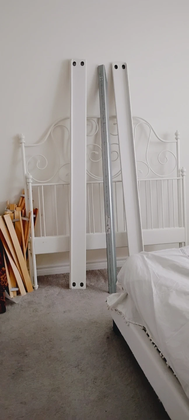 White metal bed frame with decorative headboard. Includes side rails and support pieces. Ready for assembly.