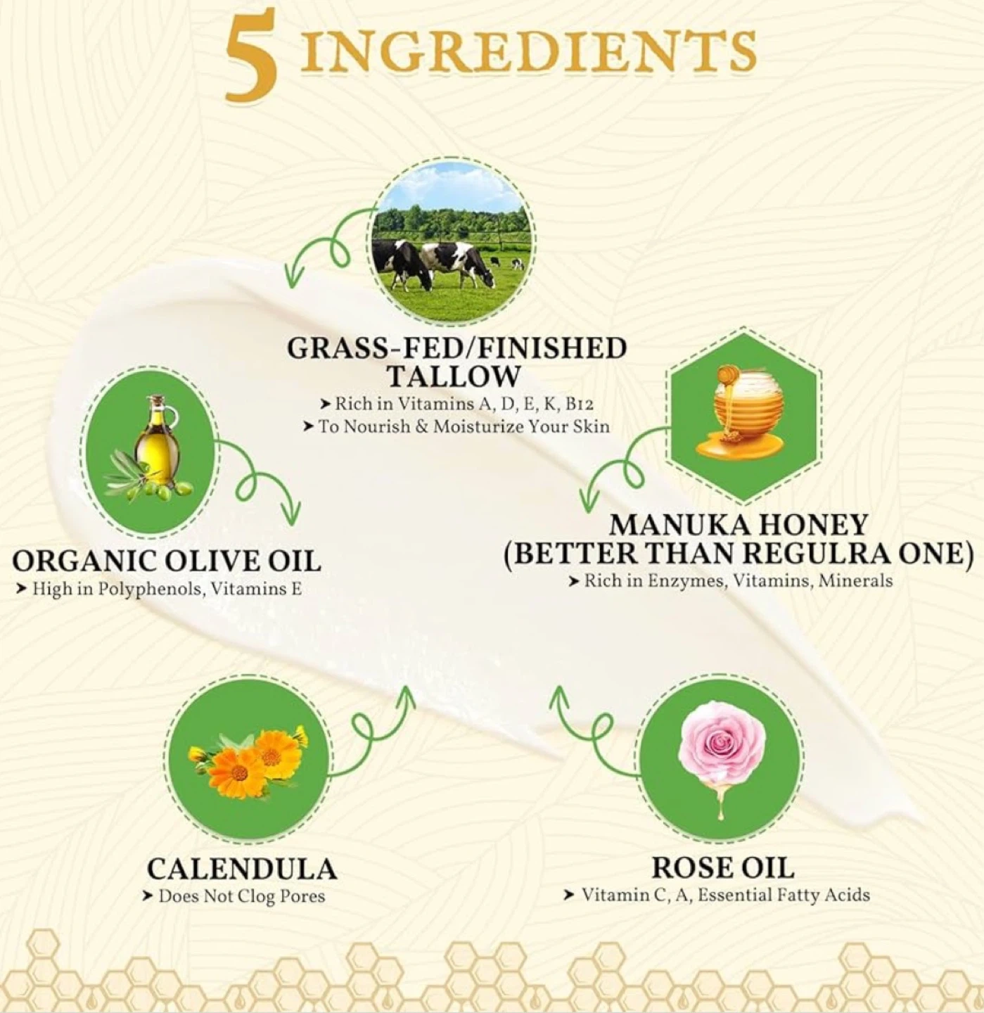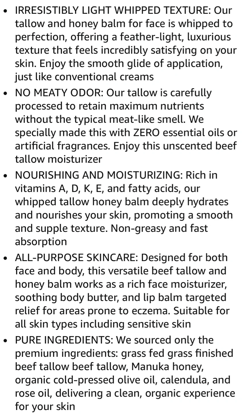 This all-natural whipped balm is made with grass-fed beef tallow + Manuka honey, designed to deeply moisturize and nourish skin.