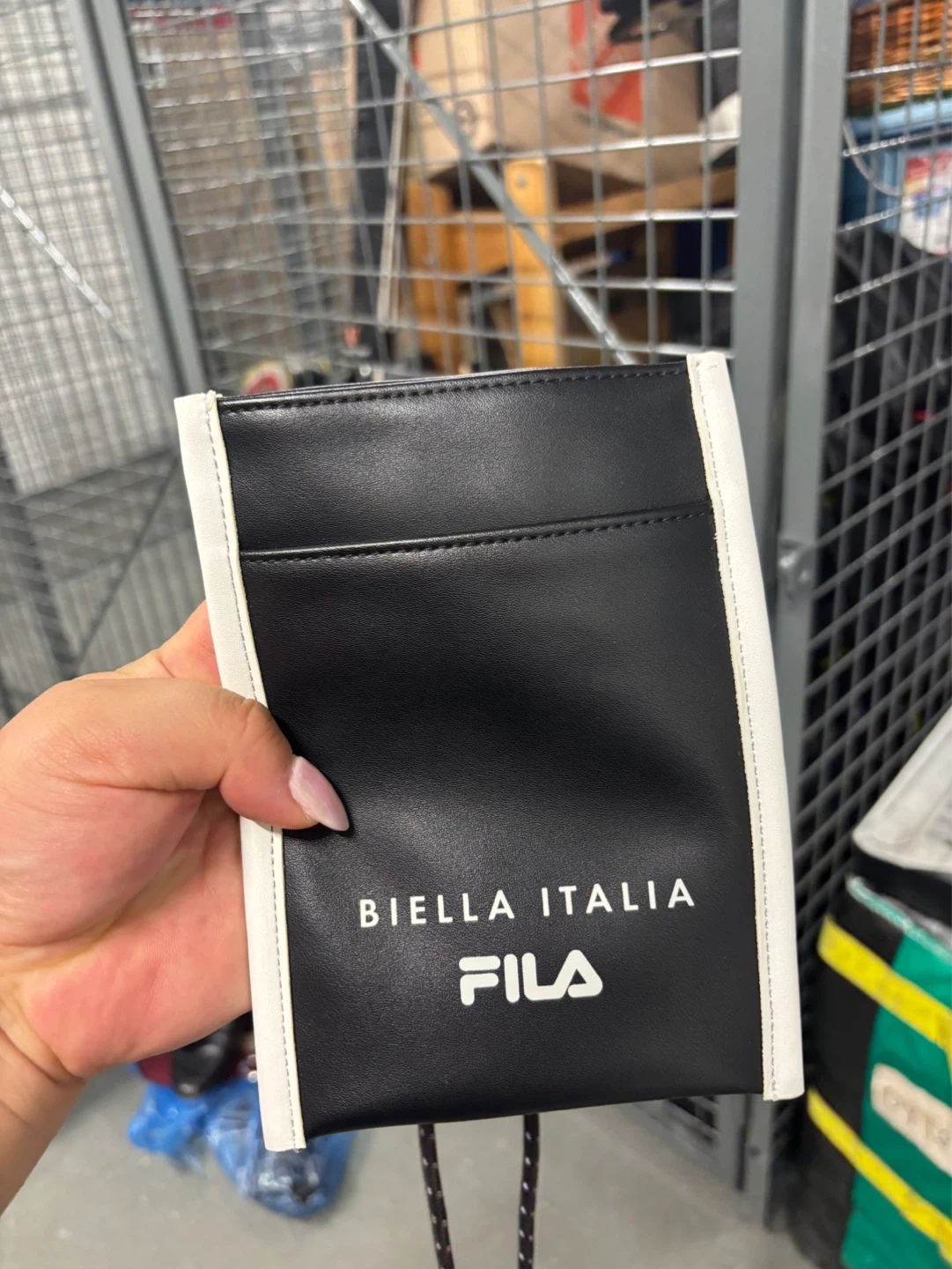 This Fila phone pouch is black with white trim and features the Biella Italia logo. It has a simple pocket design and comes with a drawstring. It's perfect for keeping your phone handy!