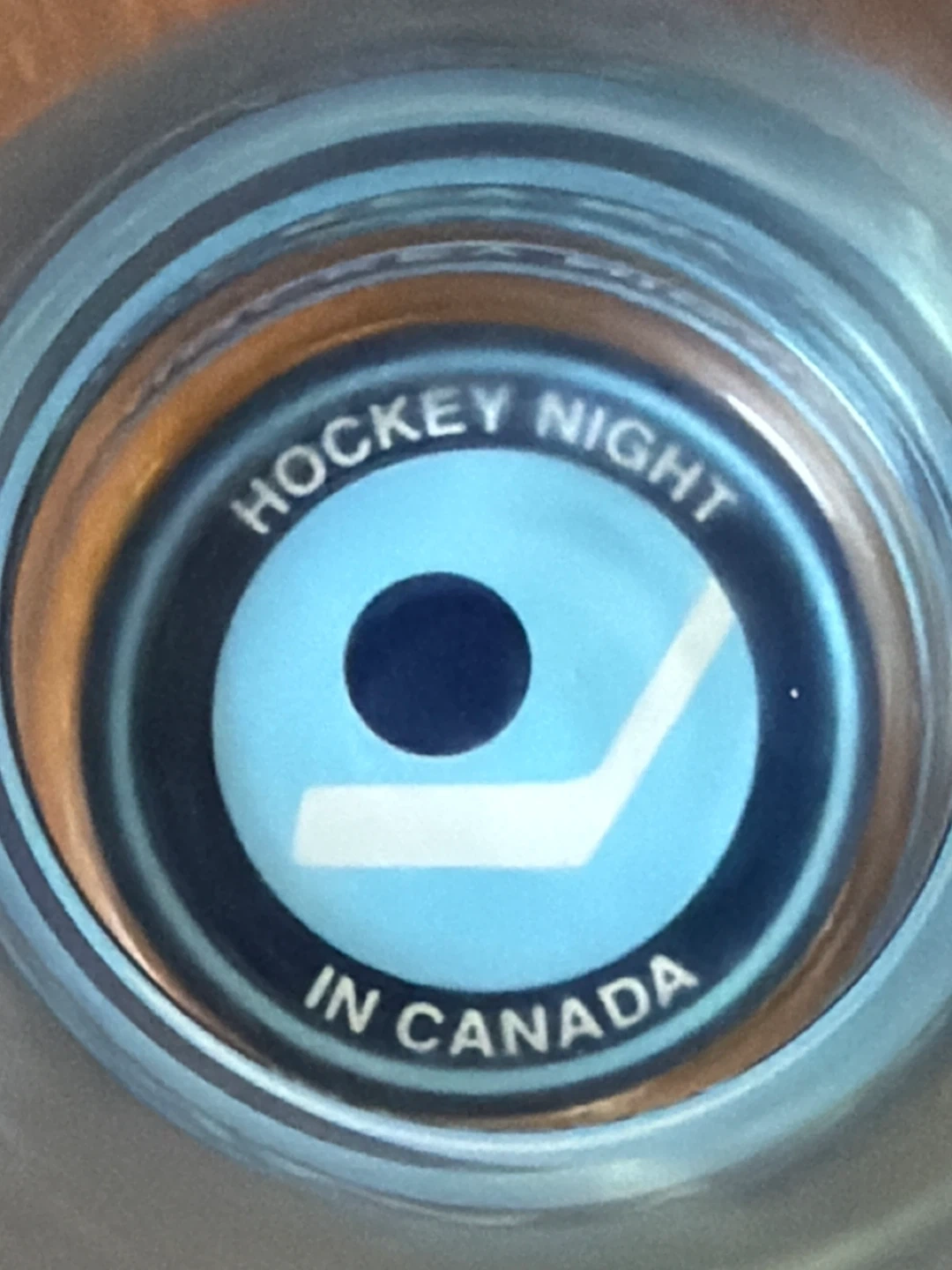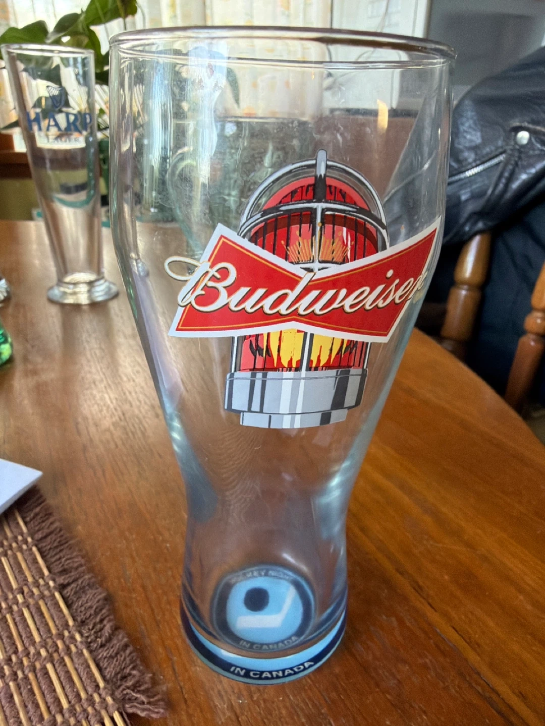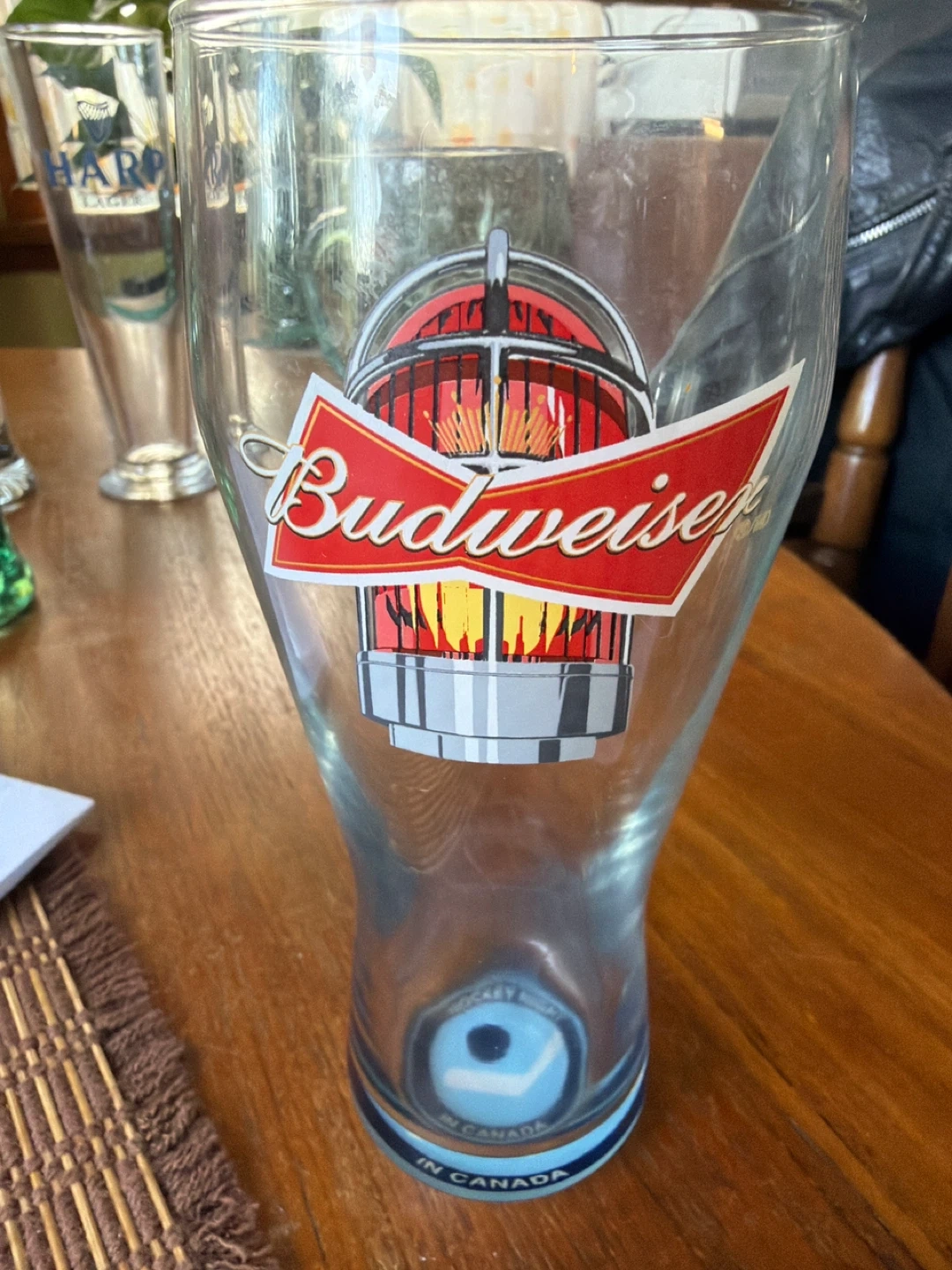 This dishwasher safe Budweiser glass features the Hockey Night In Canada logo. Holds 16oz beer, 7in. tall and made of glass. Original cost $19.19 as collectable from