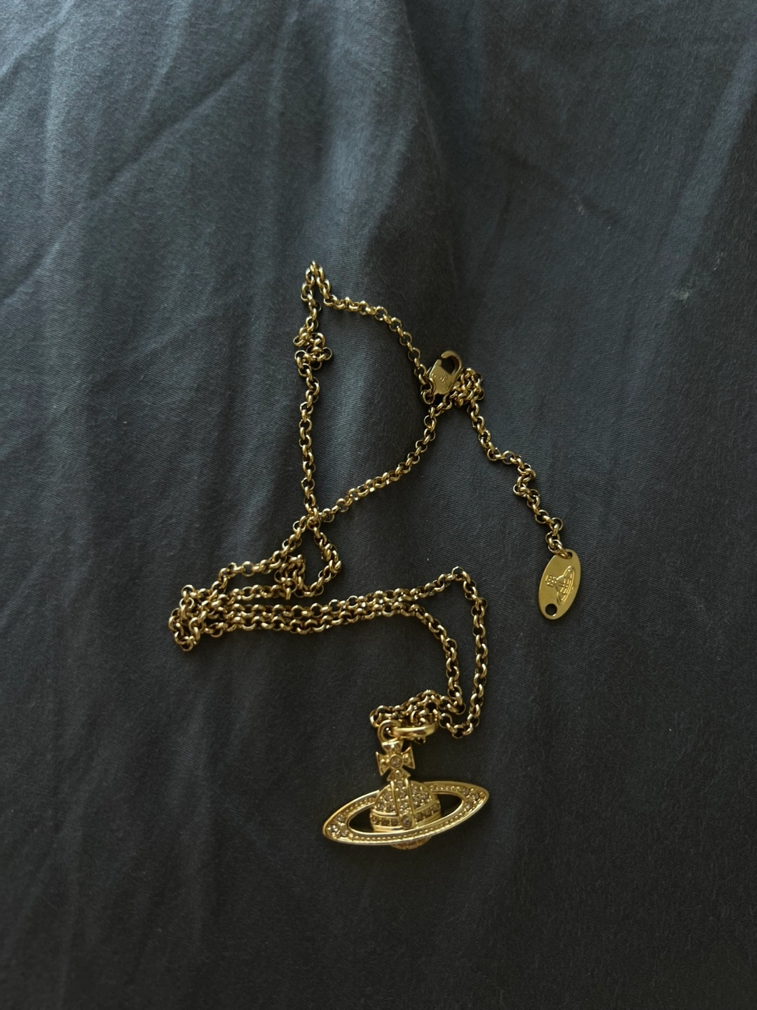 Gold-tone chain necklace. Features a small orb pendant embellished with clear stones. Comes with a small tag.