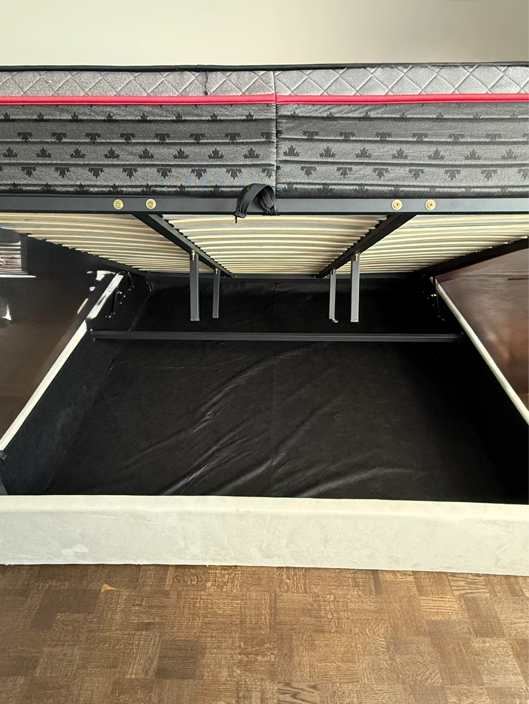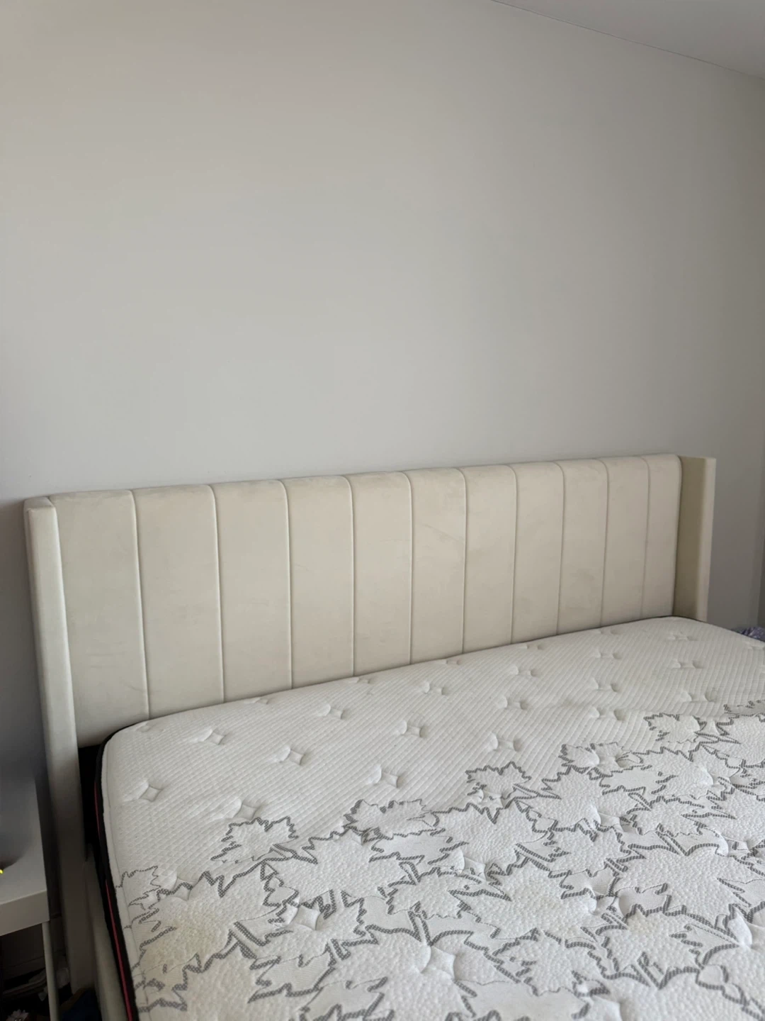 Cream velvet queen bed frame featuring a channel tufted headboard and built-in storage. It has a sturdy metal support system for the mattress. This bed frame offers a clean, modern look for any bedroom.