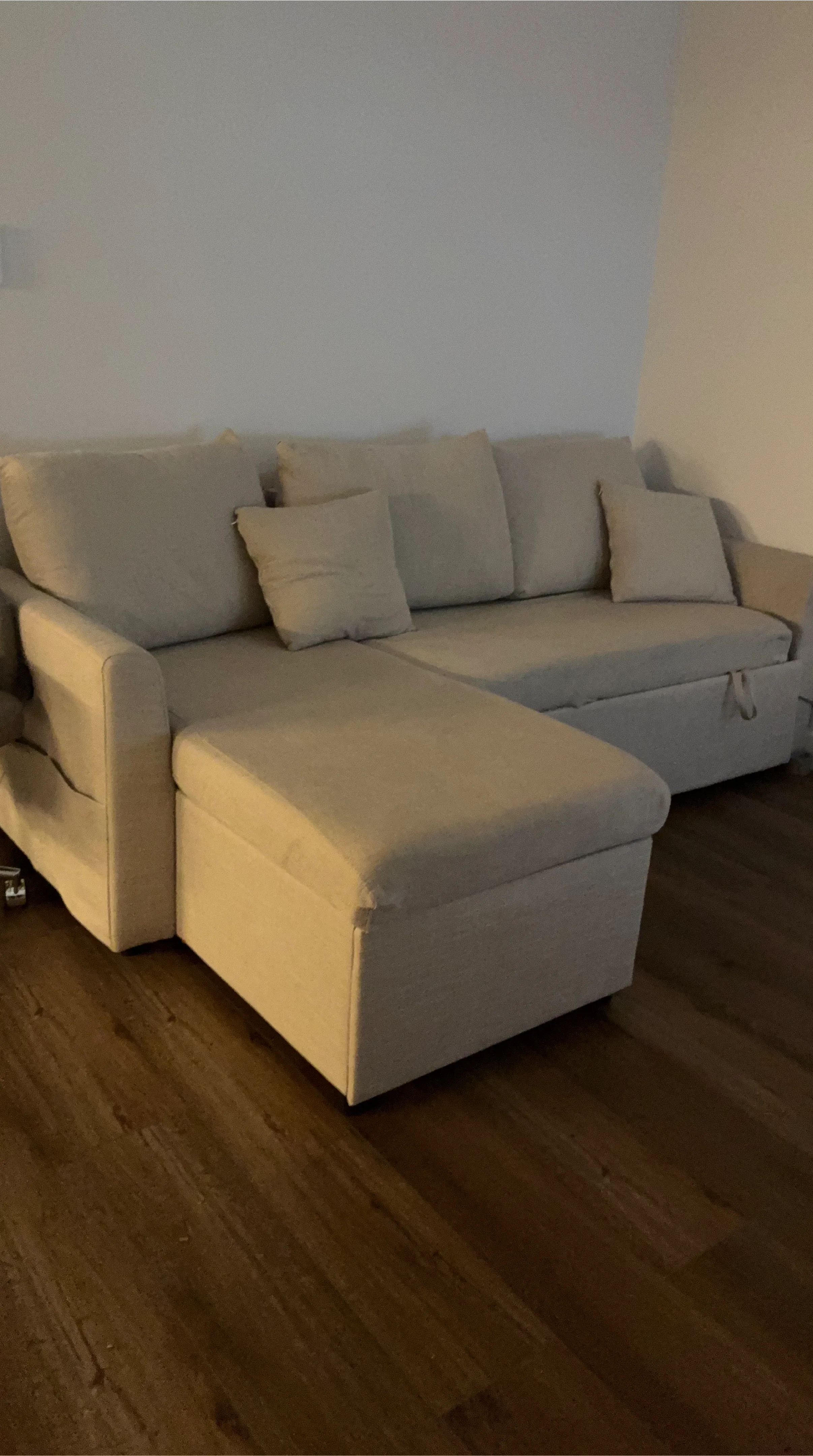 Selling a comfortable beige sleeper sofa with a chaise lounge! It's in good condition and ready for a new home. Perfect for relaxing or accommodating guests