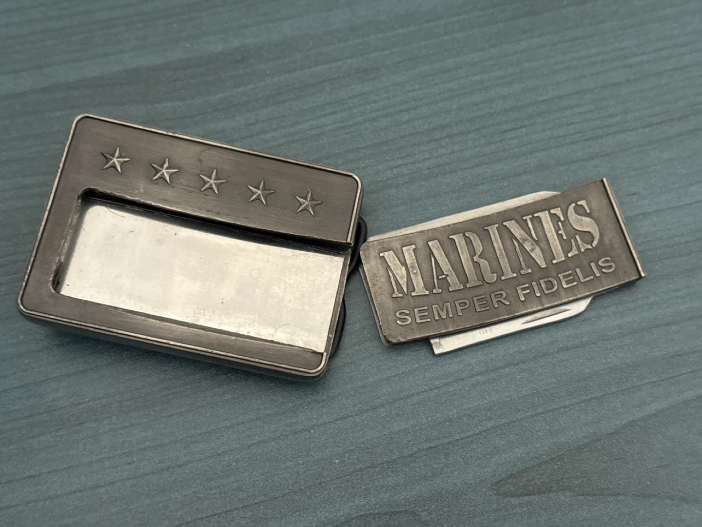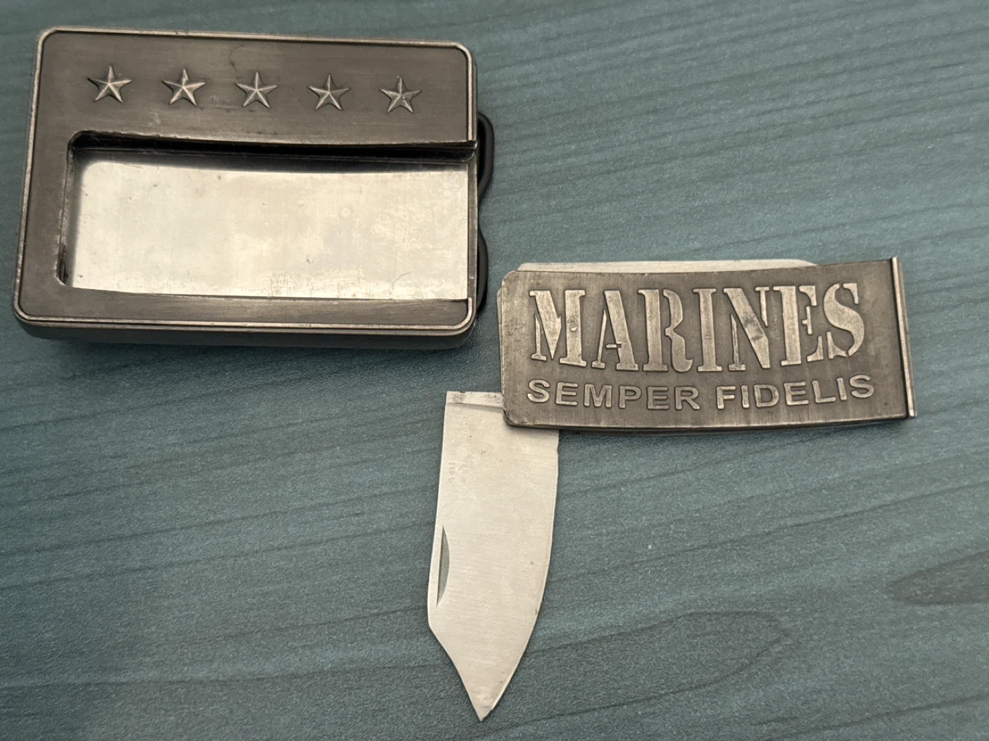 This belt buckle features the US Marines emblem with 'Semper Fidelis'. It also includes a small, concealed knife. A great piece for any Marine or supporter!