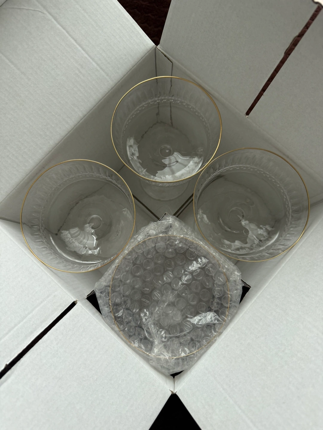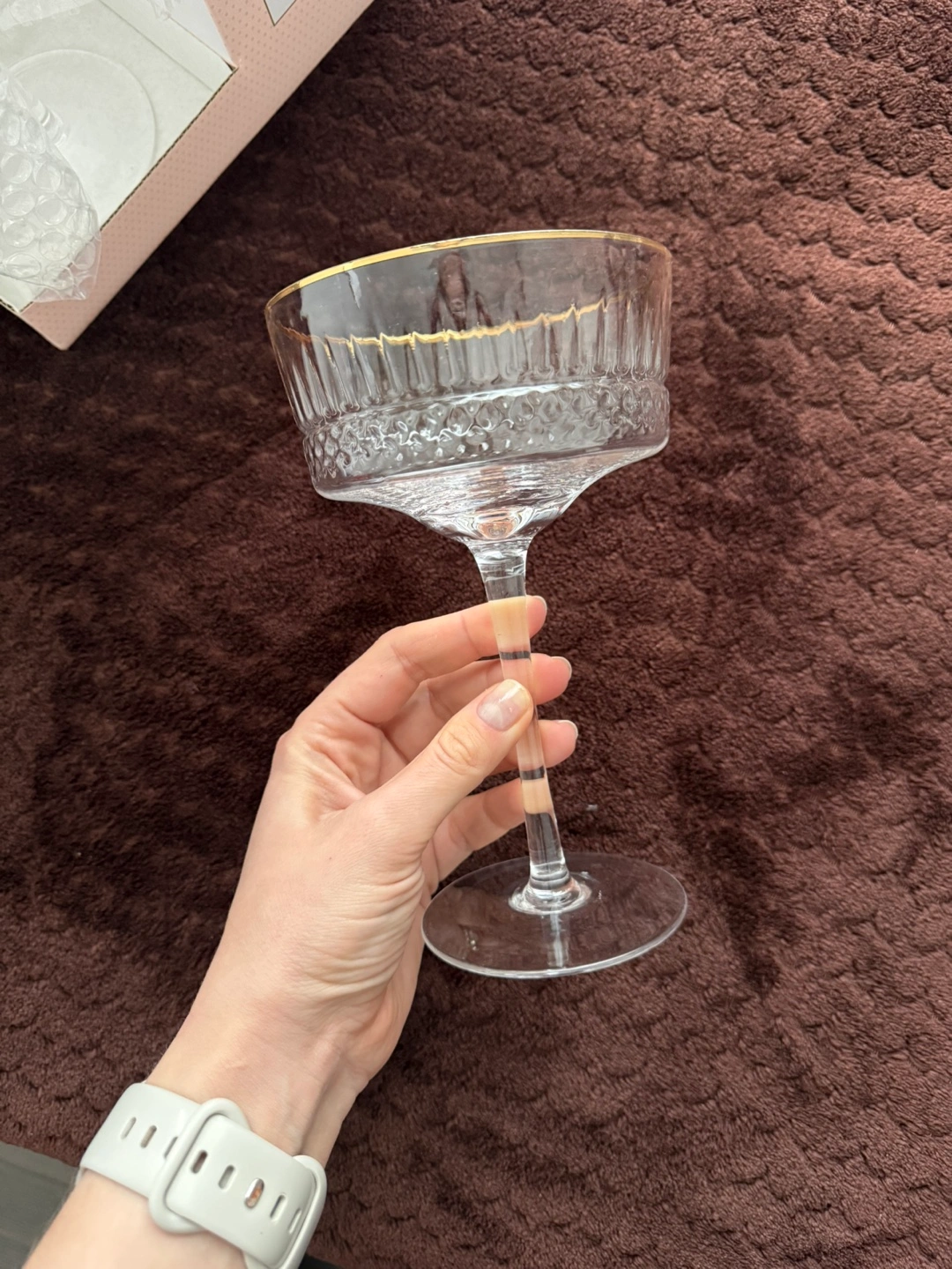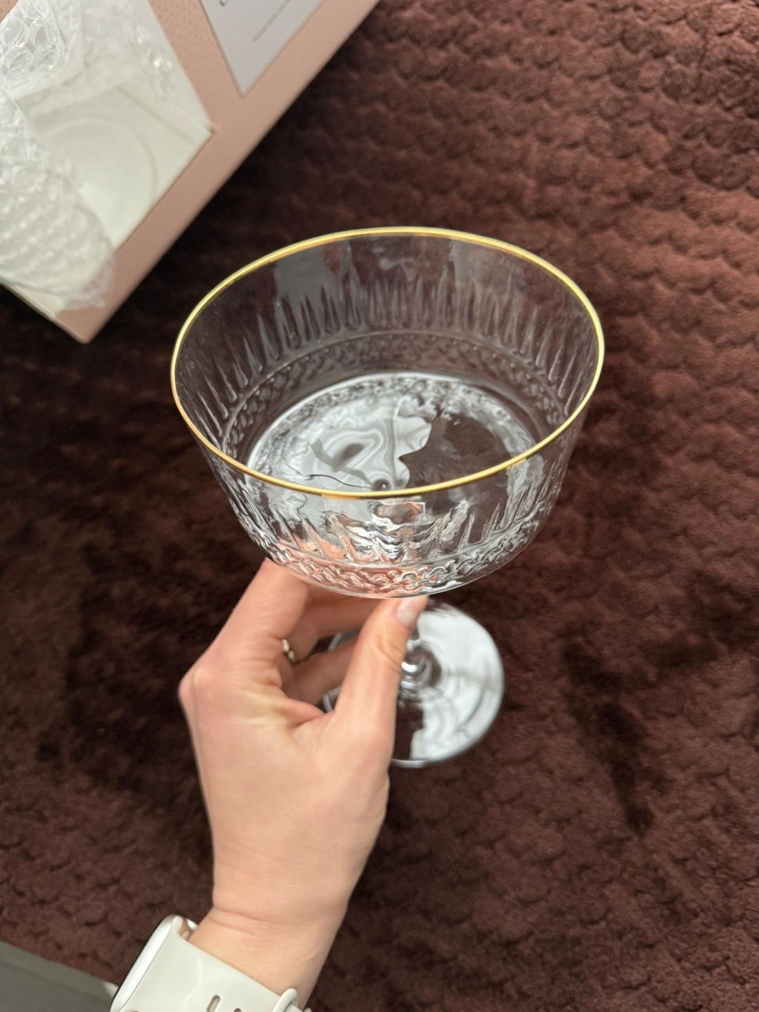 Set of four coupe glasses from the "Cupcakes and Cashmere" A Home collection. These elegant glasses are 12 oz / 355ml capacity each. They feature a delicate gold rim and textured glass design. Perfect for serving cocktails or champagne!