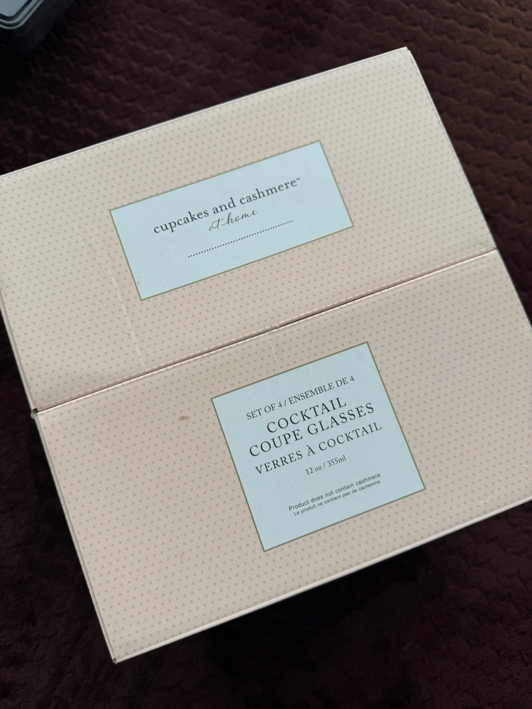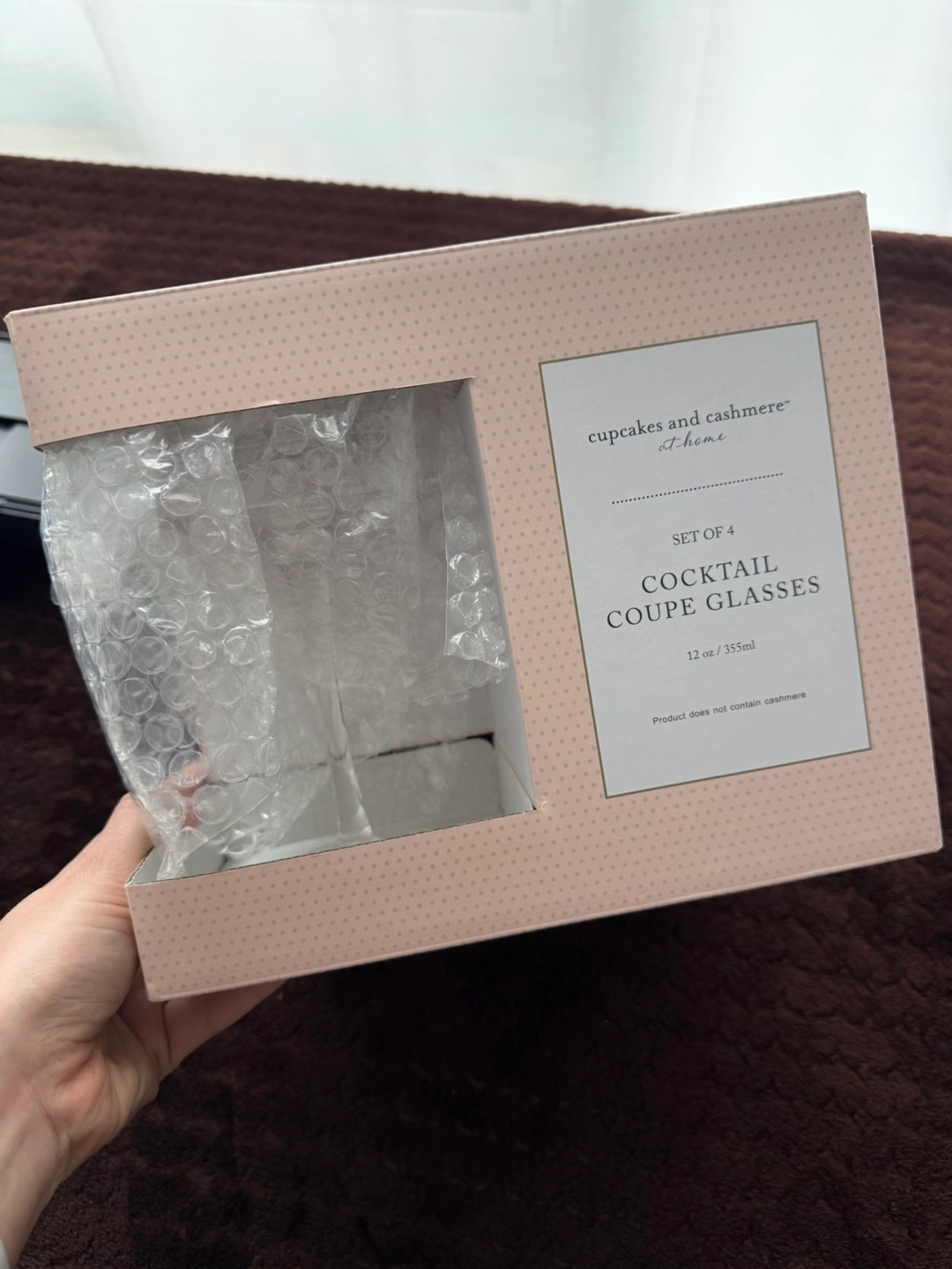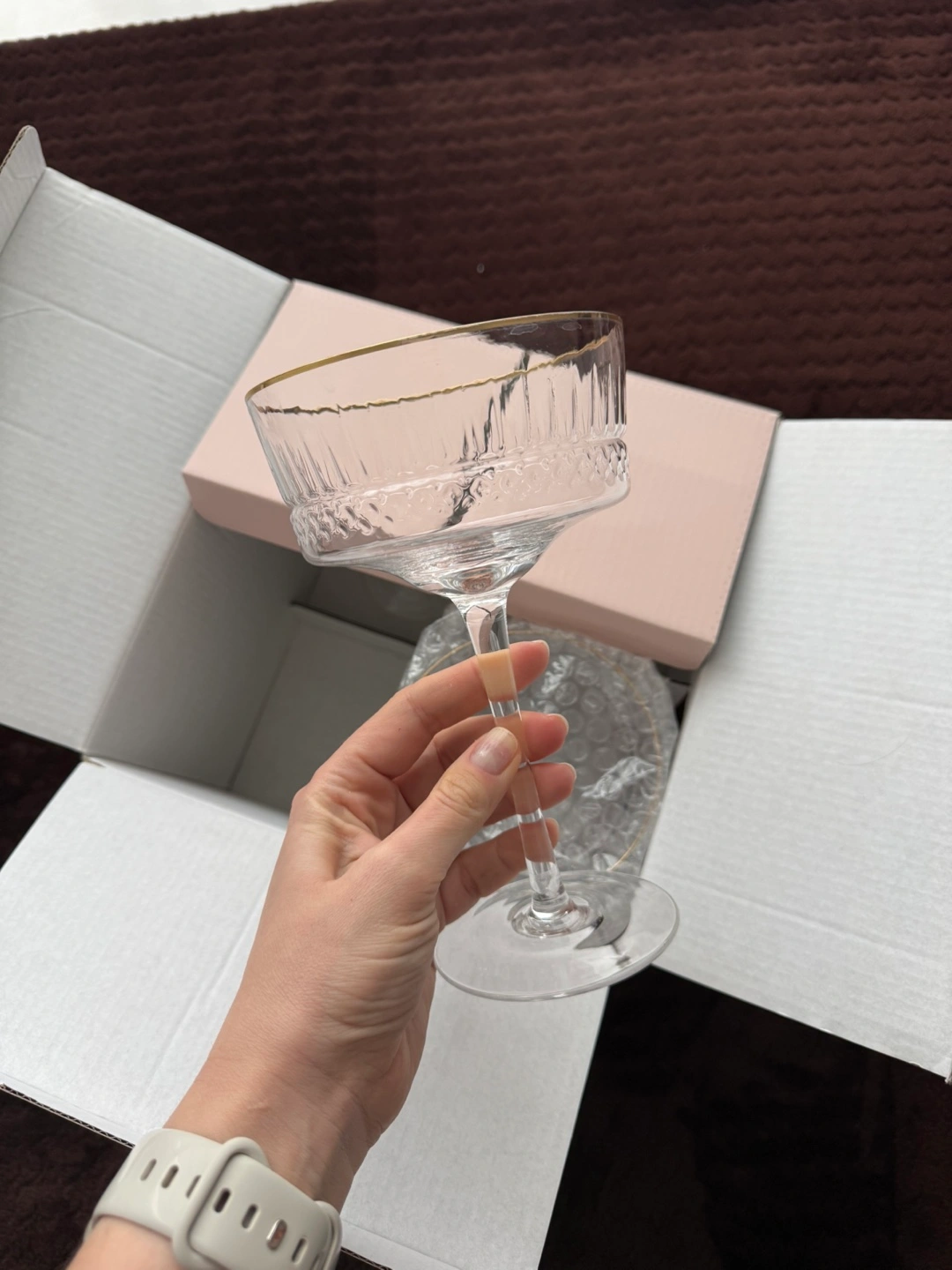Set of four coupe glasses from the "Cupcakes and Cashmere" A Home collection. These elegant glasses are 12 oz / 355ml capacity each. They feature a delicate gold rim and textured glass design. Perfect for serving cocktails or champagne!