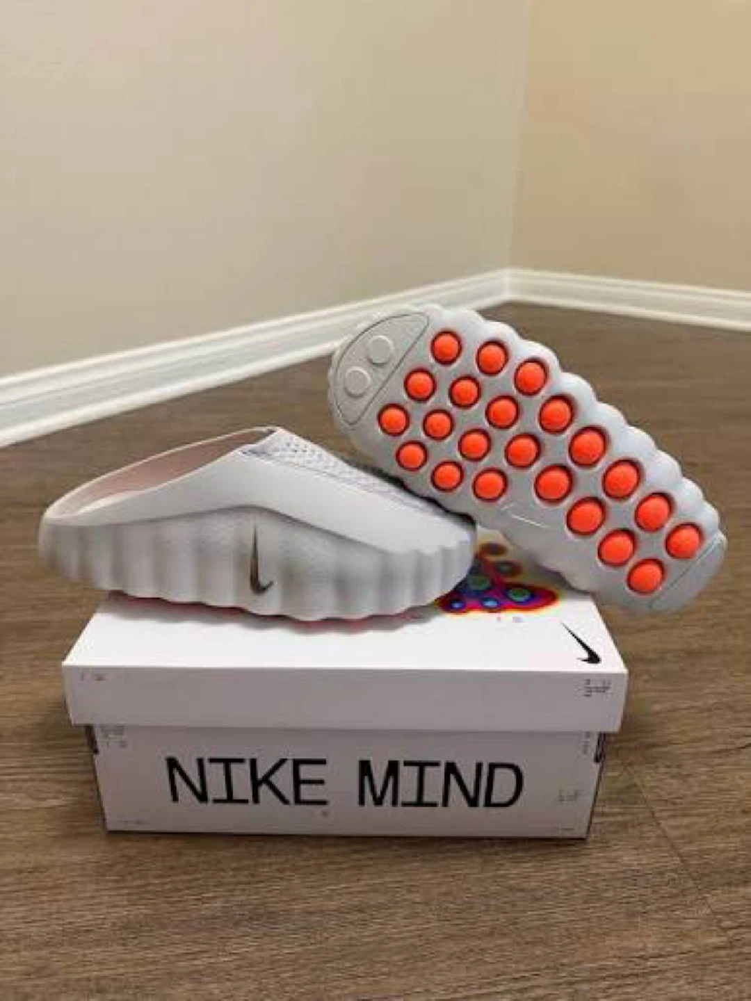 Comfortable Nike MindCure clogs in white. Features a unique sole design with orange accents. Includes original box, making them a great gift or personal purchase!