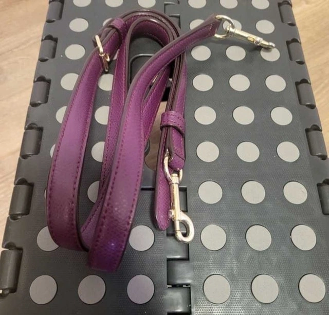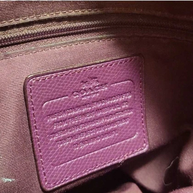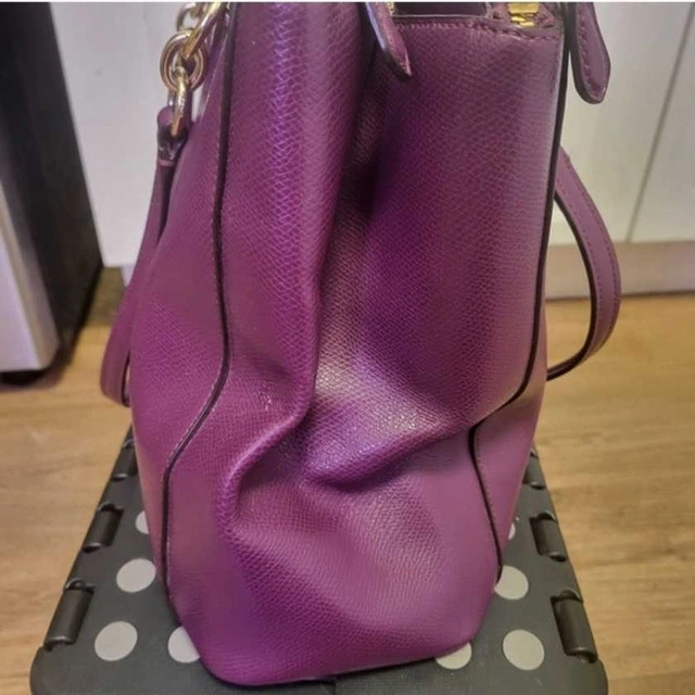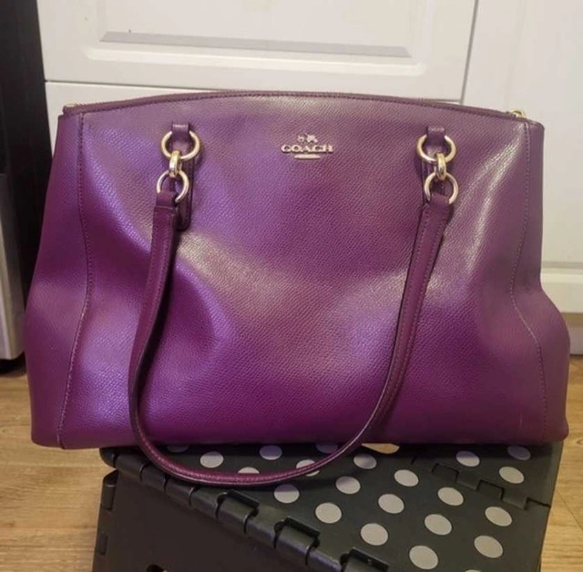 This is a used Coach satchel in a beautiful plum colour. It's in good condition, with some signs of wear. It features a zip-top closure, gold-tone hardware, and a detachable shoulder strap.