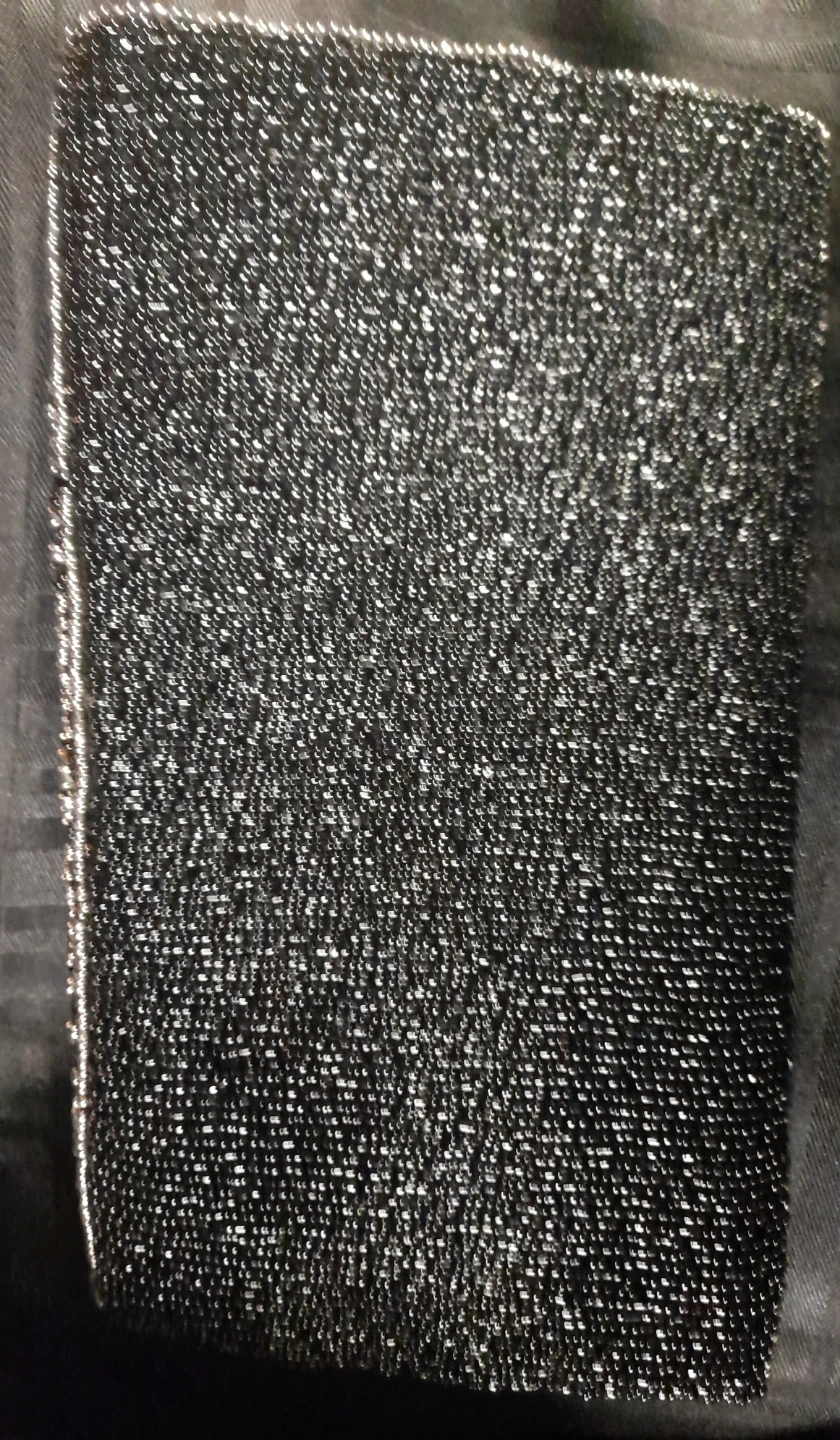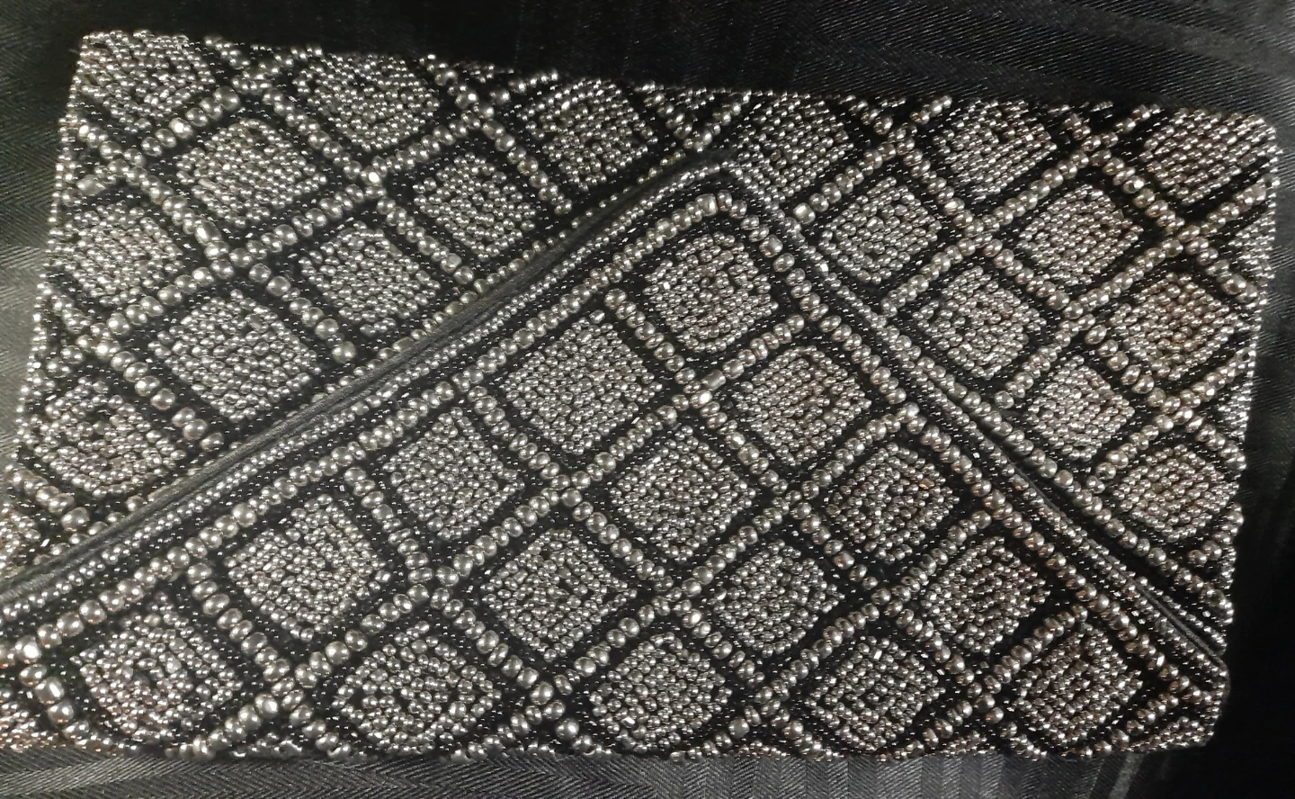 This beaded clutch purse is covered in intricate silver and black beading. It has a diamond pattern design. It's perfect for formal occasions or a night out!