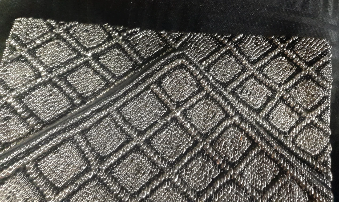This beaded clutch purse is covered in intricate silver and black beading. It has a diamond pattern design. It's perfect for formal occasions or a night out!