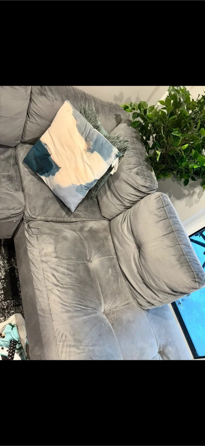 Comfortable tufted grey sectional sofa. Upholstered in soft velvet-like fabric. Features stylish nailhead trim detailing along the base. Offers ample seating space for gatherings.