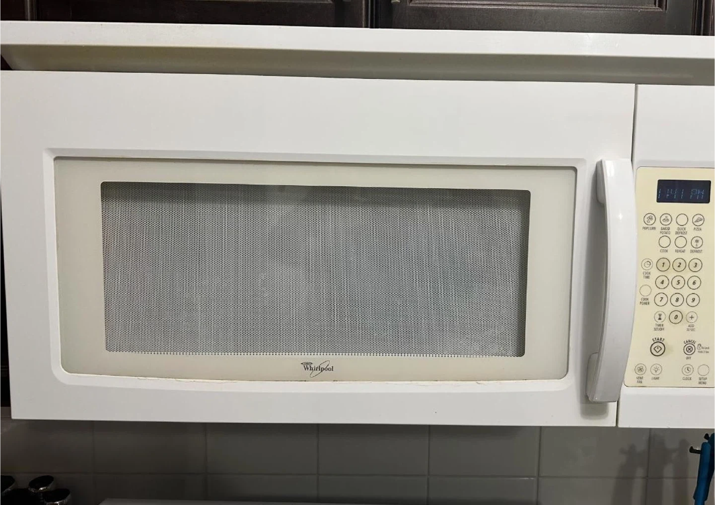 This is a white Whirlpool over-the-range microwave. It has a digital display and a control panel with pre-programmed settings. This microwave is mounted above the stove.