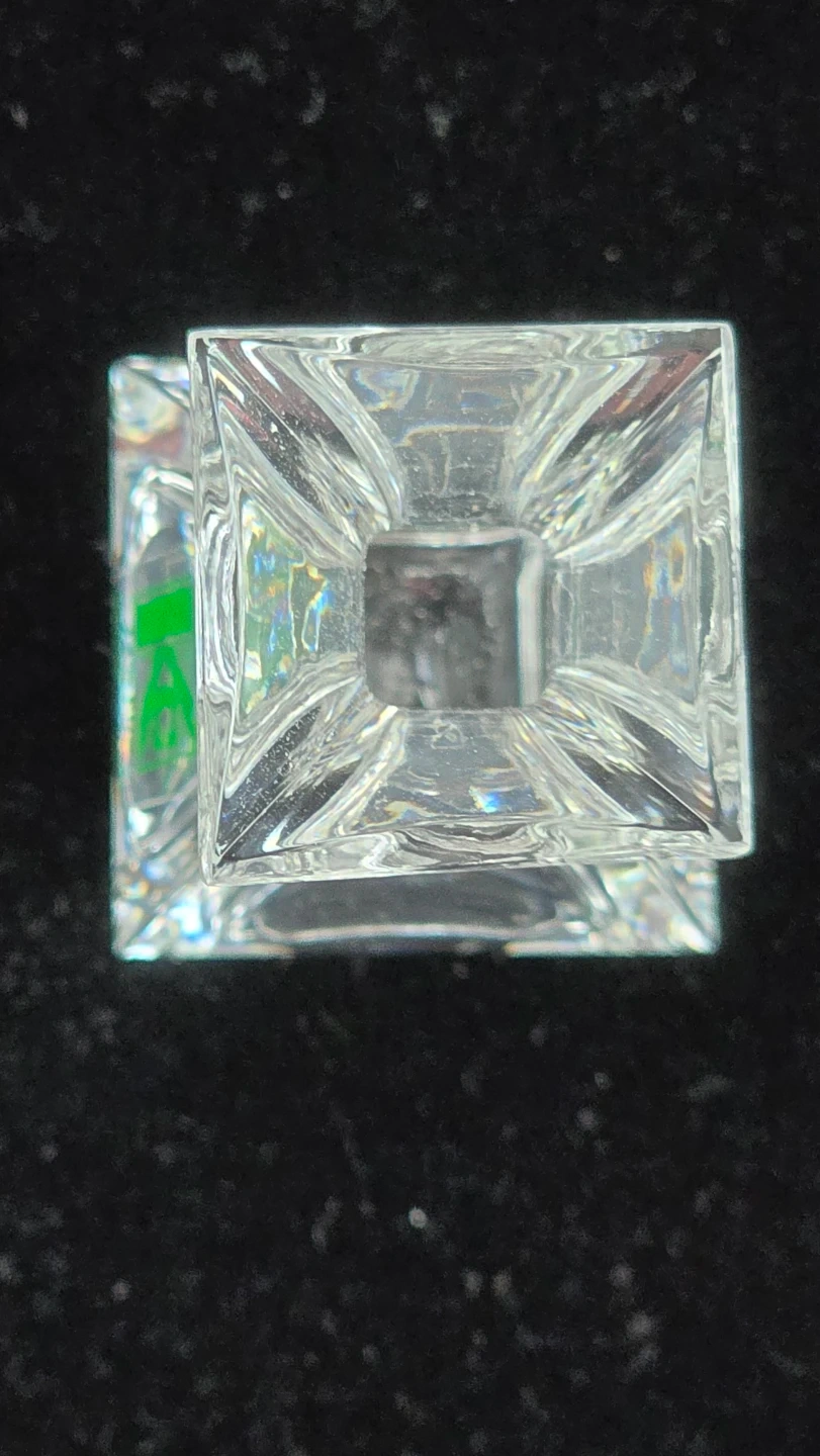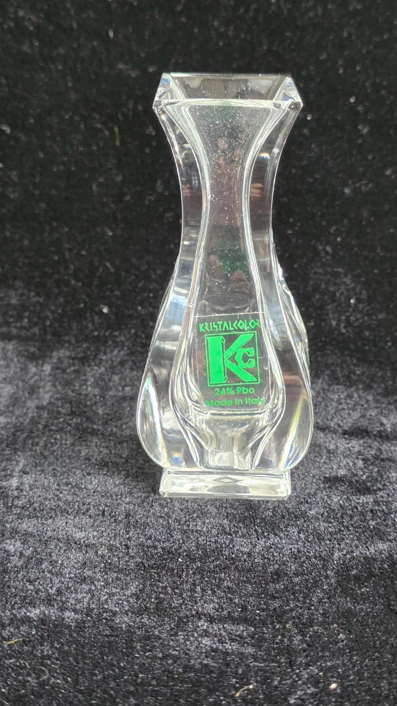 This is a clear glass bud vase from Kristalcolor. It's made of 24% Pbo glass and was manufactured in Italy. It's a lovely little piece for a single stem flower!