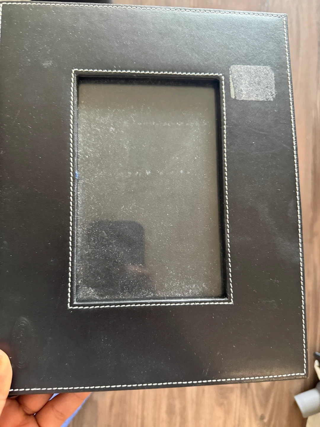 This black photo frame is covered in faux leather with decorative white stitching. It has a central opening for a picture. Minor scuffs visible on the surface.