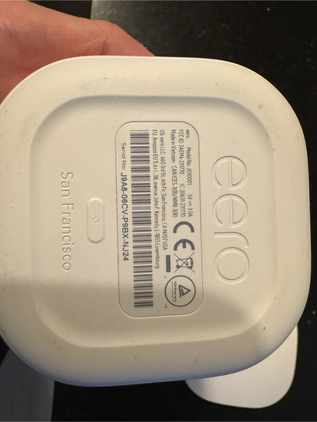 This is an Eero Wi-Fi router. It's white and comes with its power adapter and cable. This unit is great for improving your home's wireless network coverage.