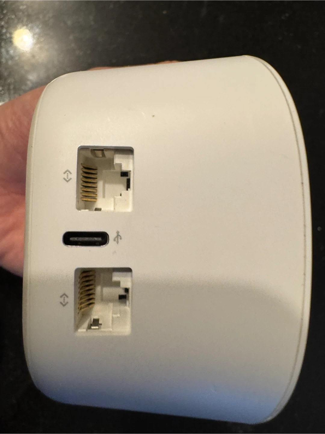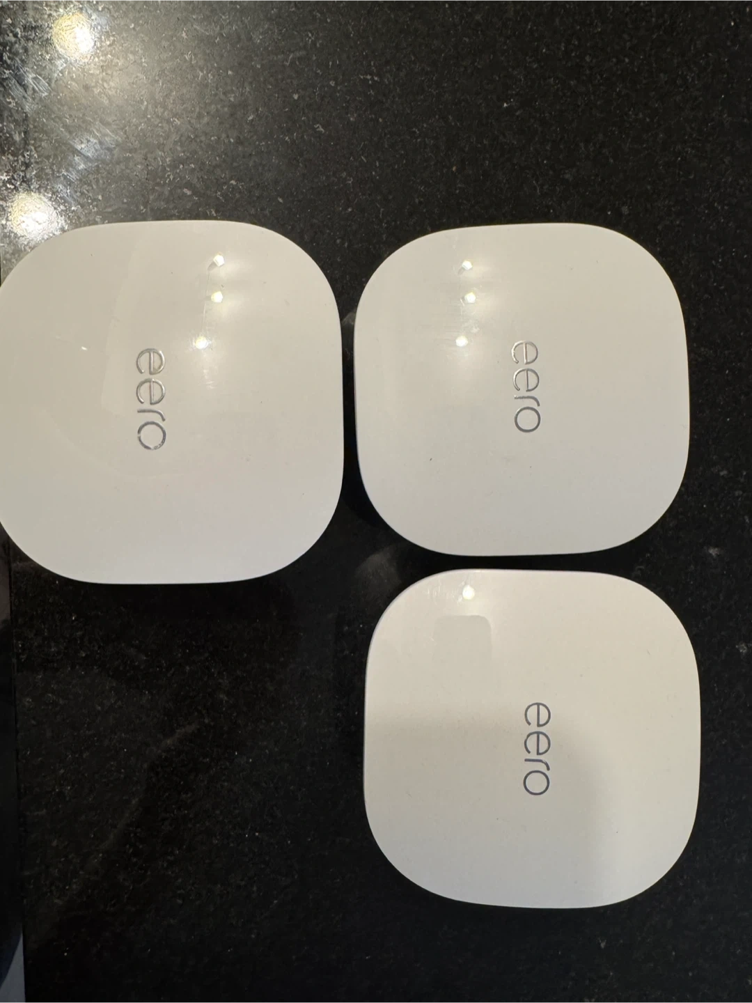 This is an Eero Wi-Fi router. It's white and comes with its power adapter and cable. This unit is great for improving your home's wireless network coverage.