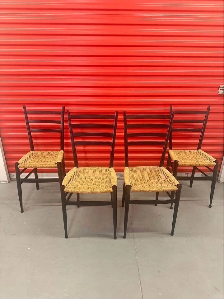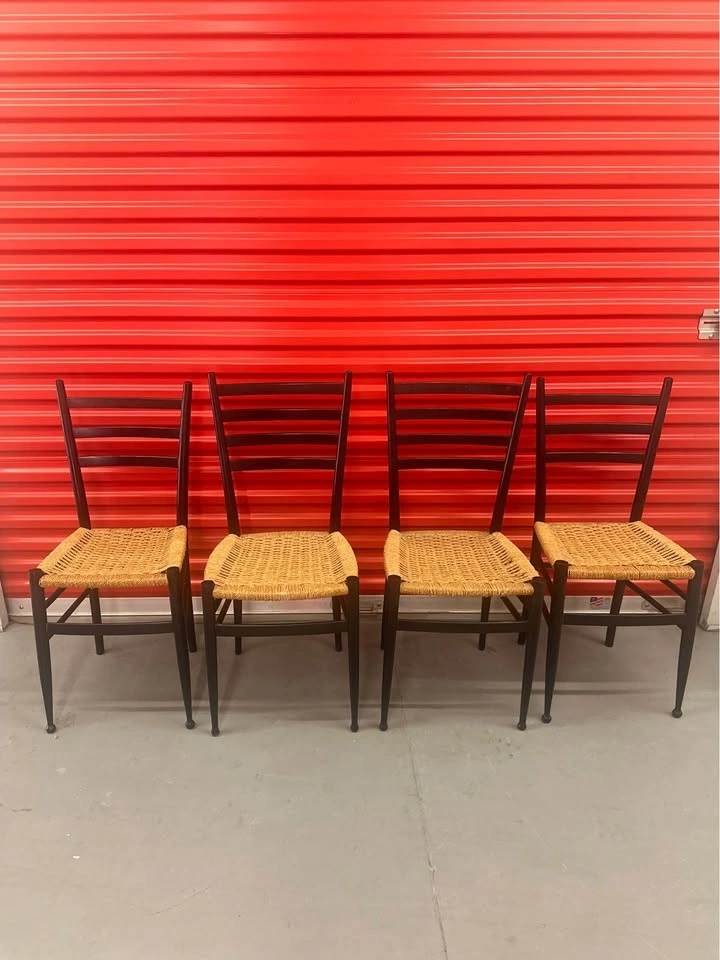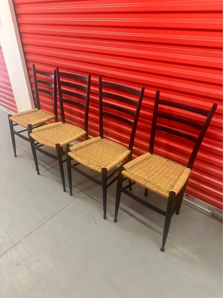 These chairs are in solid vintage condition. The set includes two head chairs and two side chairs. The frames are finished in ebonized black, and the seats are woven Danish cord. Some seats show light wear, but overall they still look great and are sturdy. Feel free to request additional photos or details.