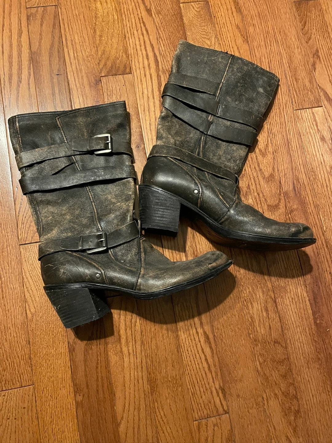 These stylish women's boots are a dark, distressed grey colour. They feature multiple buckles and straps for an edgy look. The boots have a block heel and a round toe, perfect for adding some flair to your outfit.