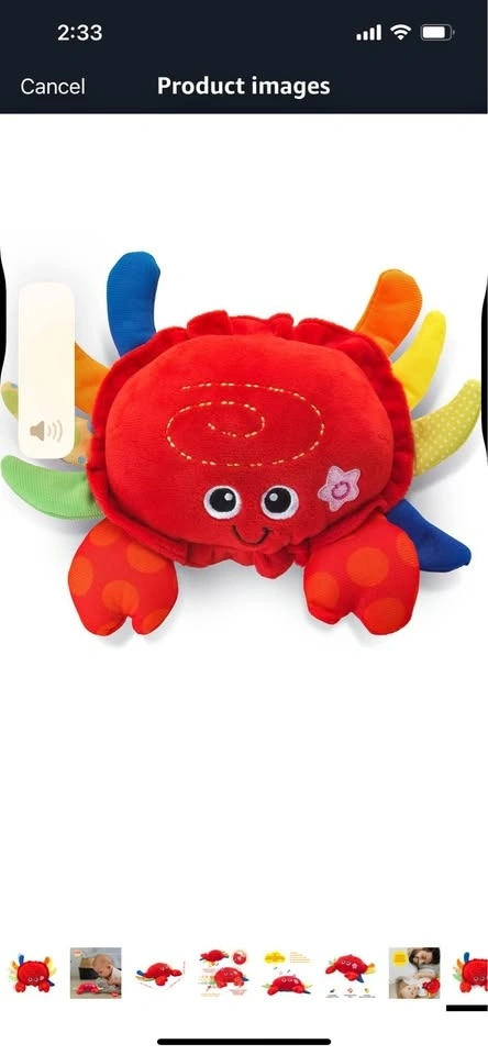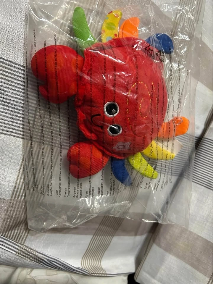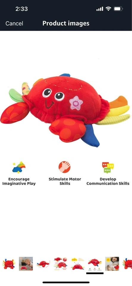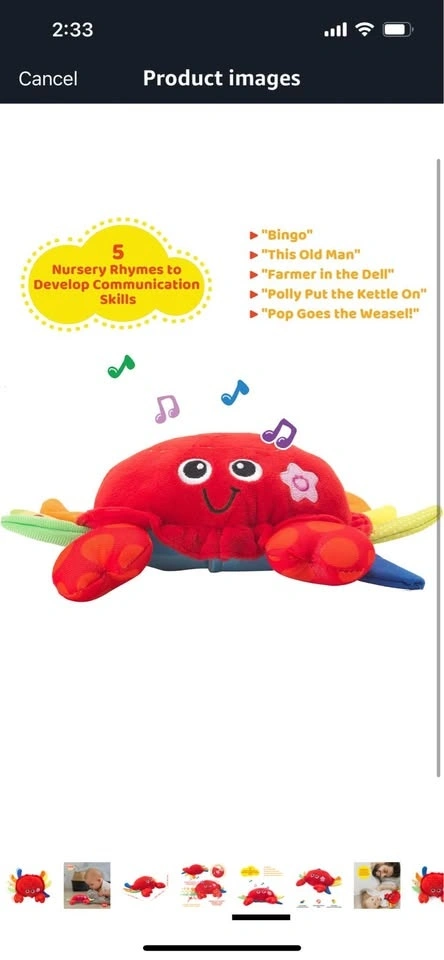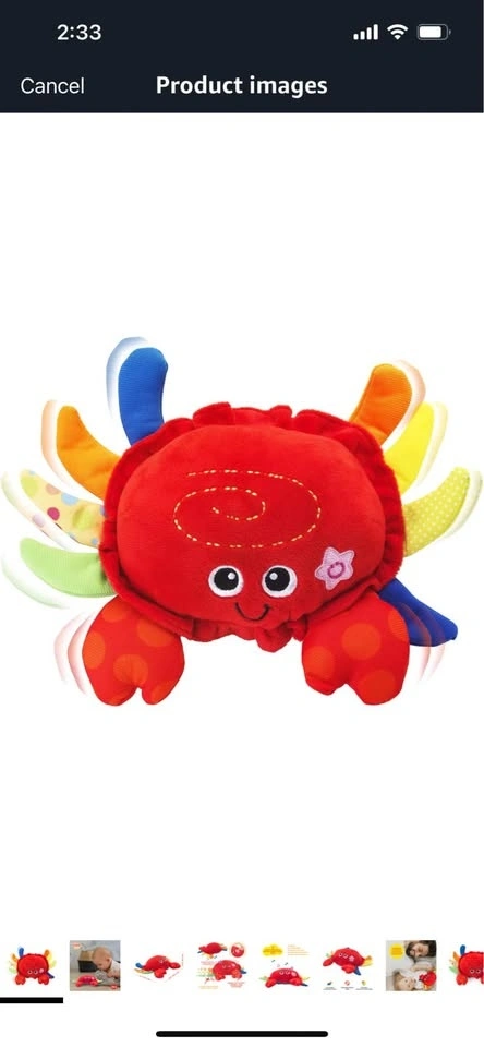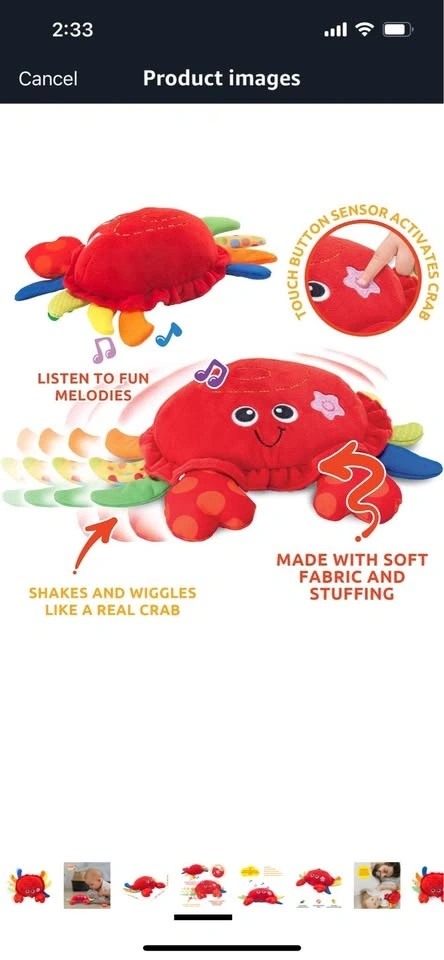 This new adorable red crab plush toy is perfect for encouraging imaginative play and stimulating motor skills! Dancing Crab for 3-6 Months Babies - Musical Crawling Toy with Touch Sensor Button, 5 Nursery Rhymes Songs & Music - Soft Plushie for Toddlers, Infants, Babies Ages 6-12 to 18 Months It's also great for developing communication skills. It's in new condition and ready fornew home!