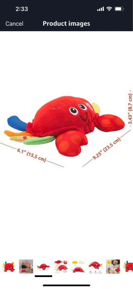 This new adorable red crab plush toy is perfect for encouraging imaginative play and stimulating motor skills! Dancing Crab for 3-6 Months Babies - Musical Crawling Toy with Touch Sensor Button, 5 Nursery Rhymes Songs & Music - Soft Plushie for Toddlers, Infants, Babies Ages 6-12 to 18 Months It's also great for developing communication skills. It's in new condition and ready fornew home!
