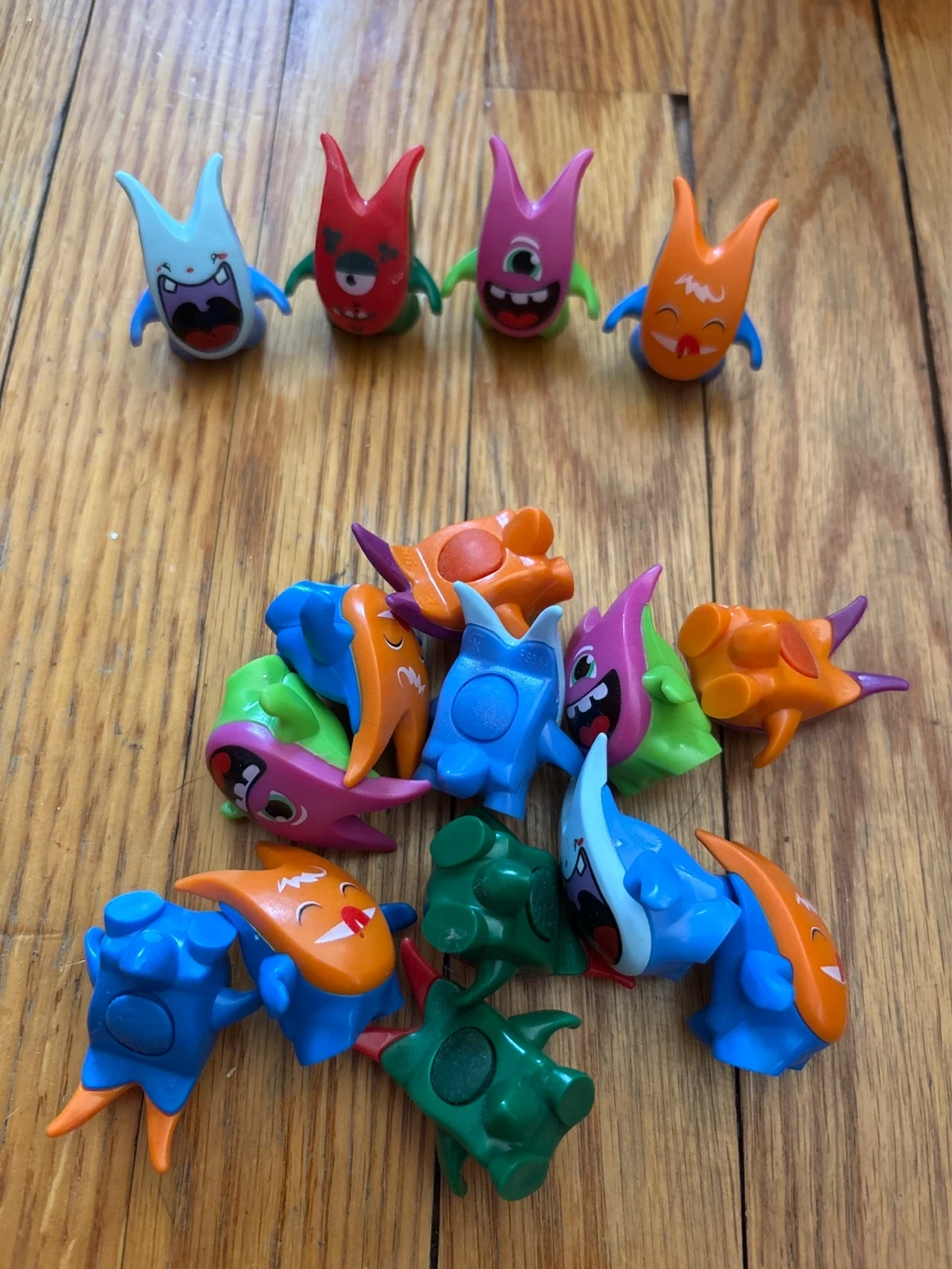 This is a lot of 16 assorted monster figurines. They come in various bright colours like blue, orange, pink, and green. These are fun, small toys with unique designs.