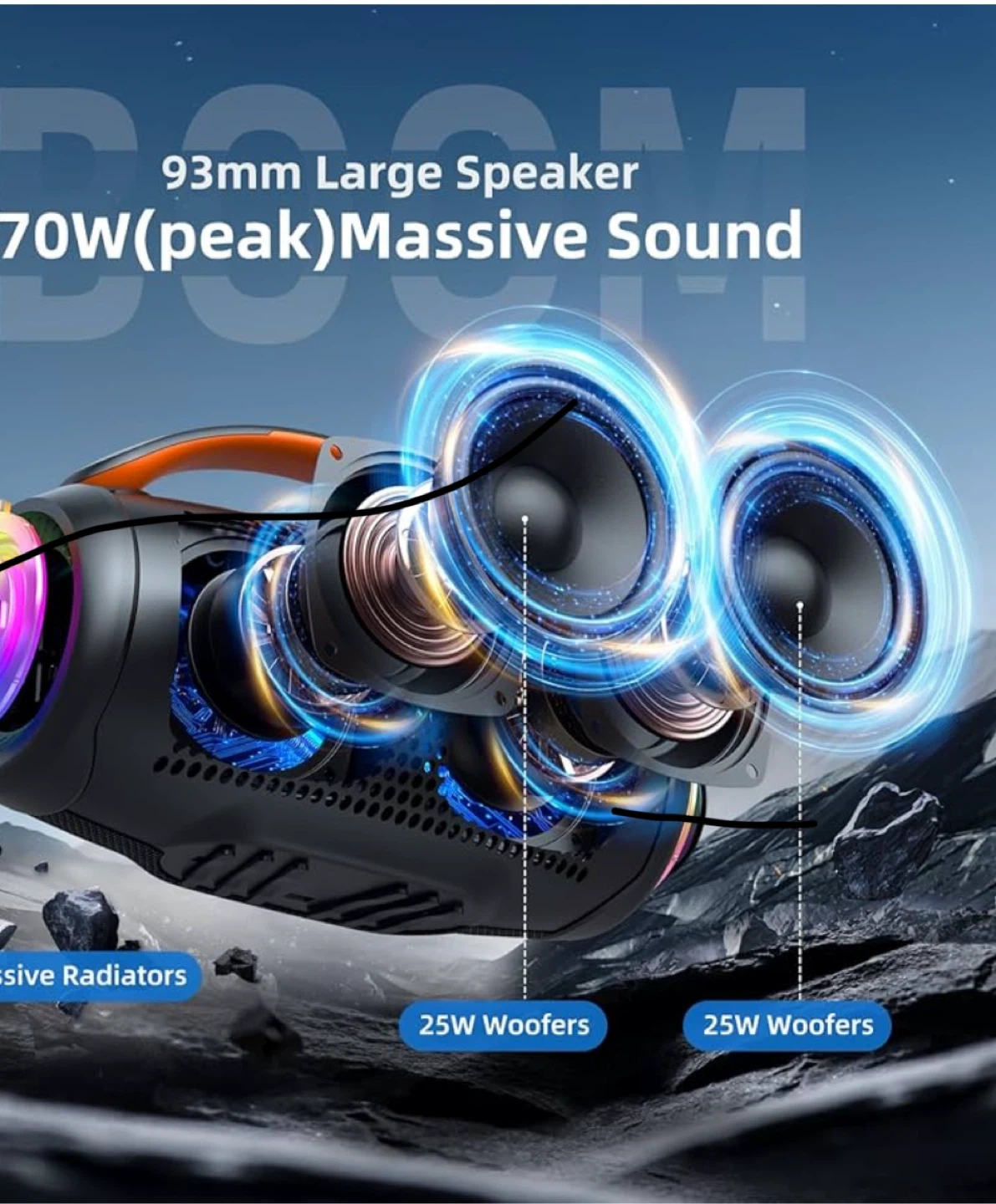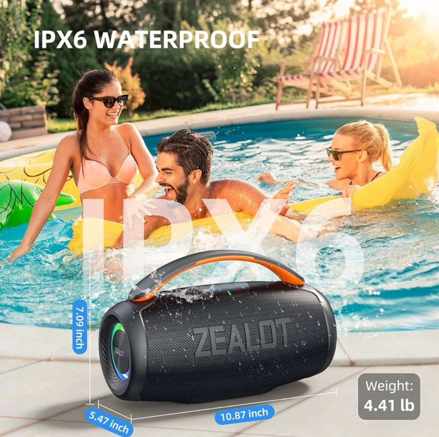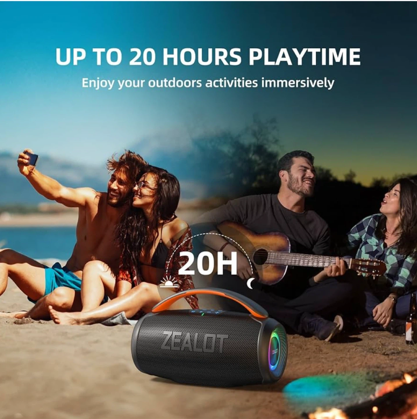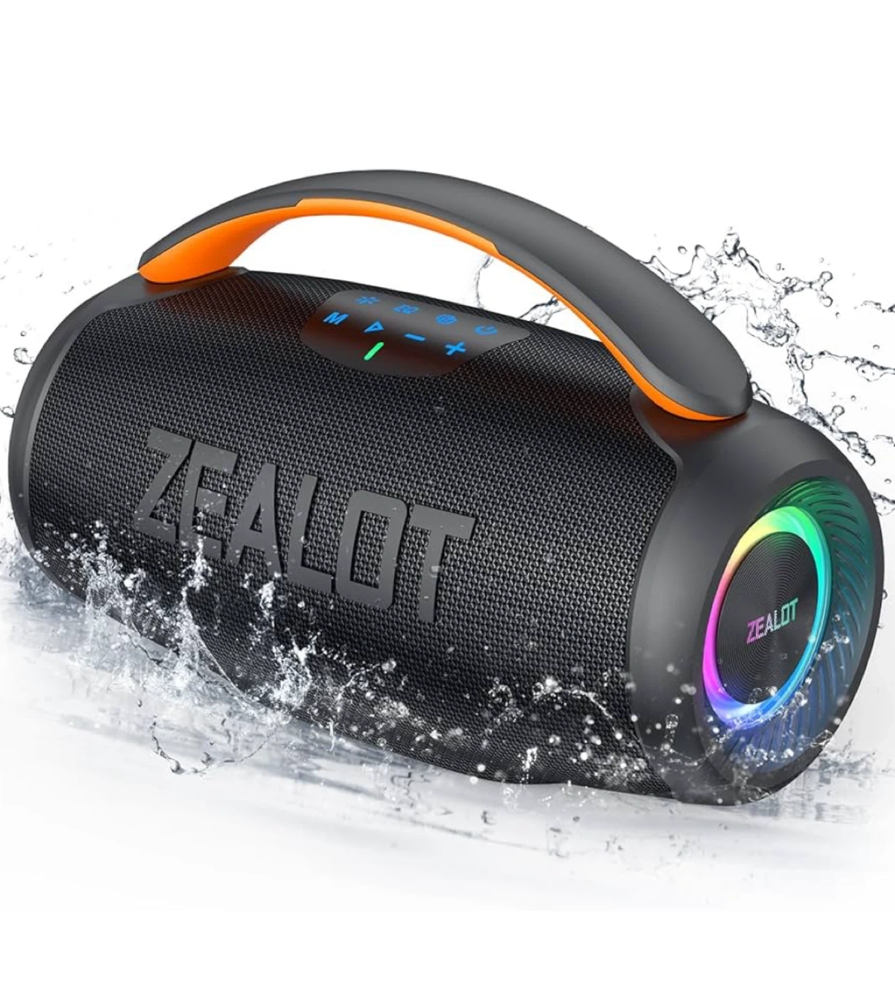 This Zealot S28 is a portable Bluetooth speaker with IPX6 waterproof rating. It offers up to 20 hours of playtime and supports true wireless stereo pairing. The speaker boasts a 93mm large speaker with 50W output and massive sound.