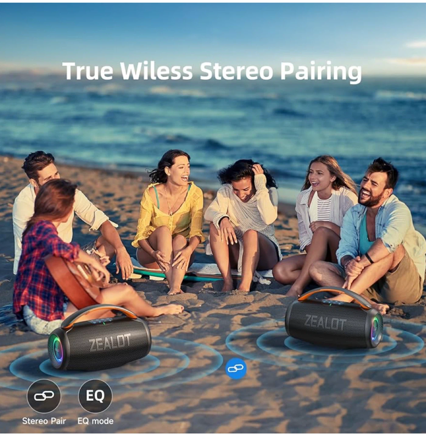 This Zealot S28 is a portable Bluetooth speaker with IPX6 waterproof rating. It offers up to 20 hours of playtime and supports true wireless stereo pairing. The speaker boasts a 93mm large speaker with 50W output and massive sound.