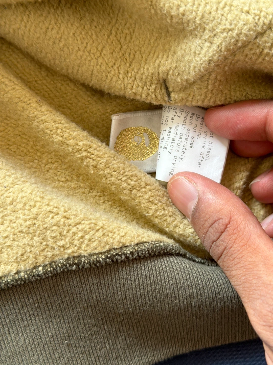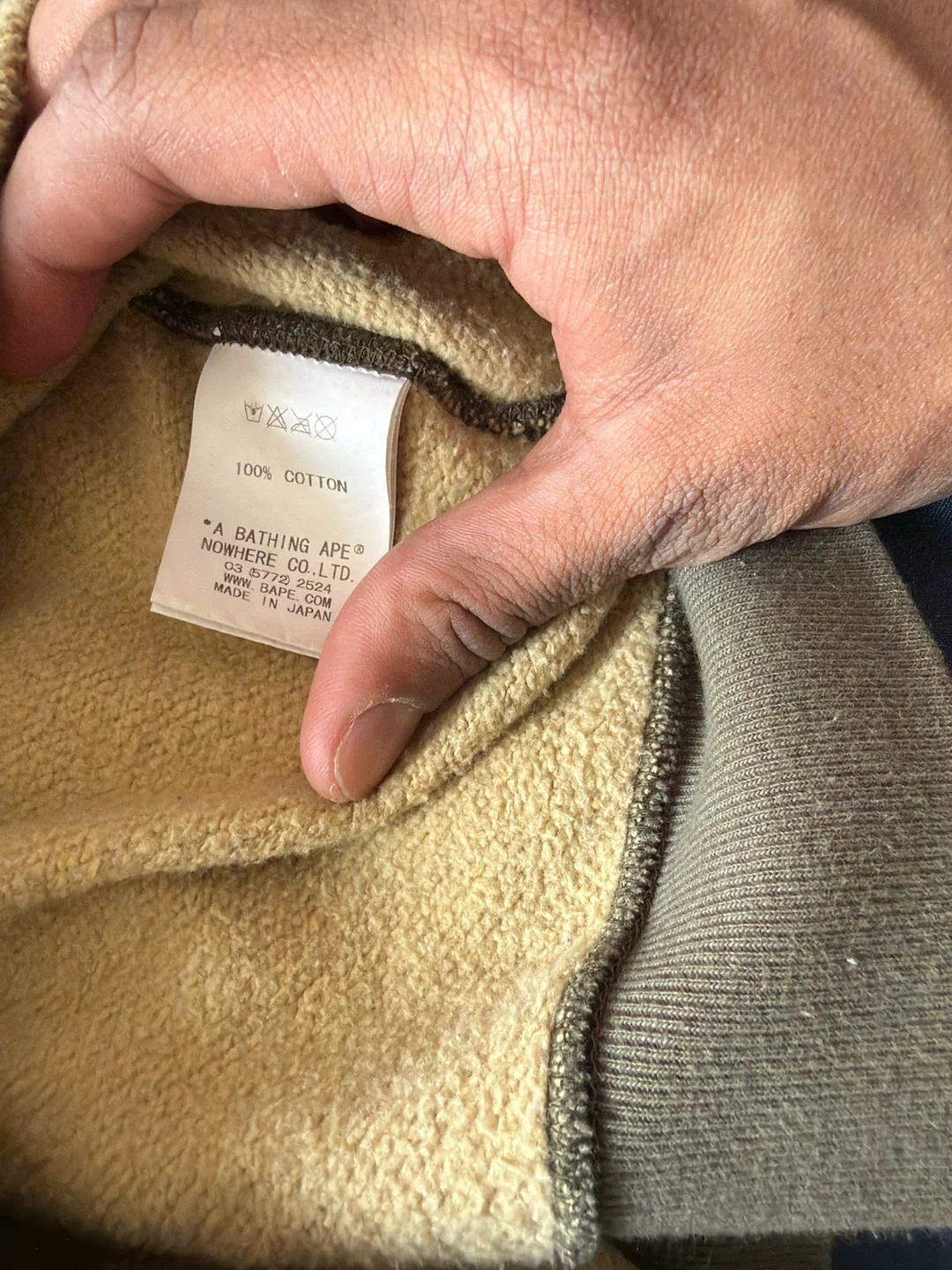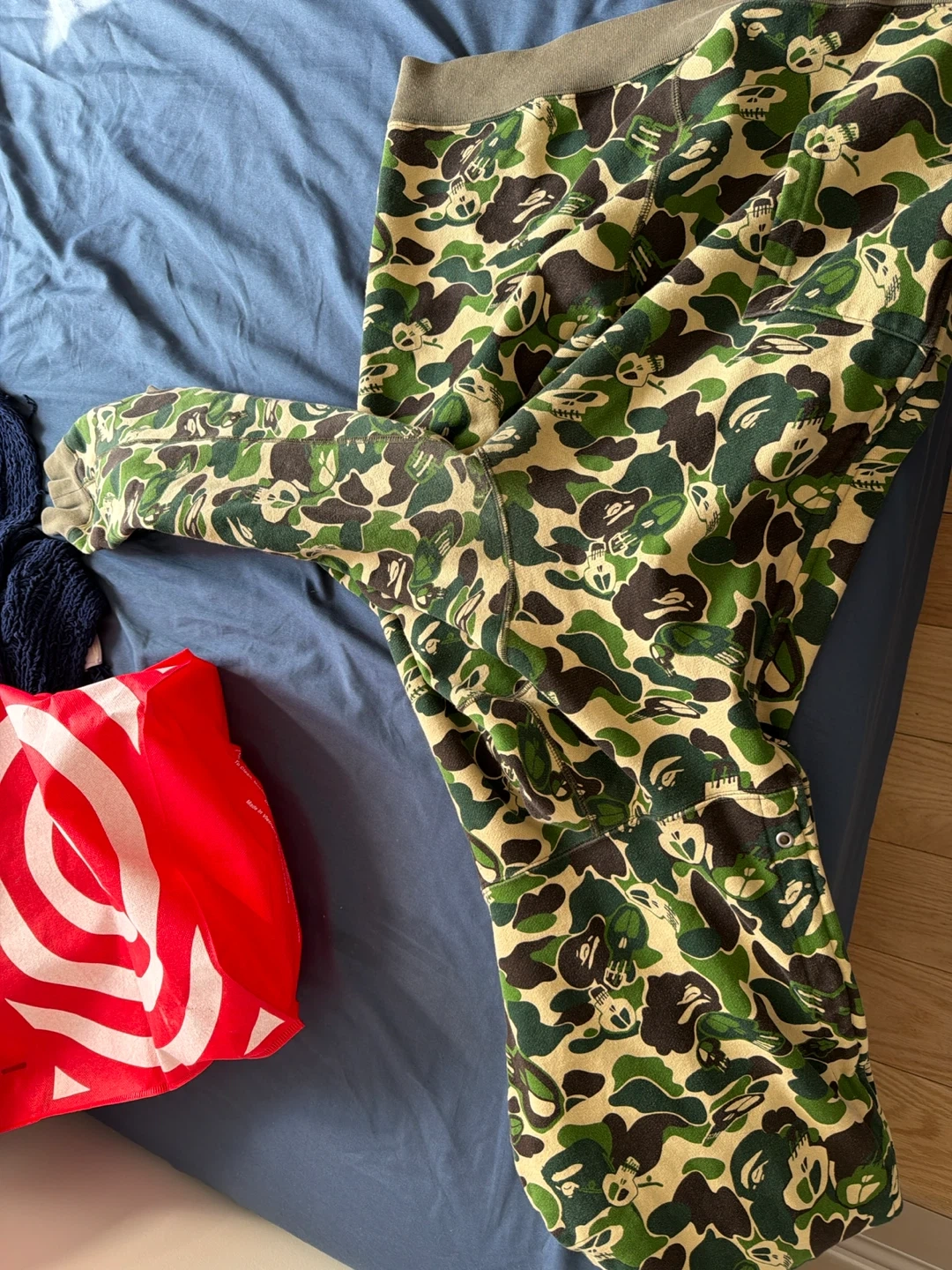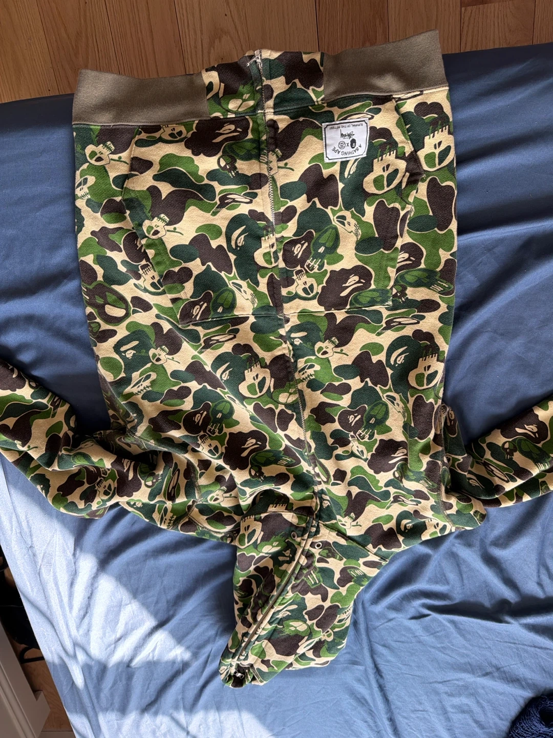 This is a camouflage hoodie from A BATHING APE®. It's made of 100% cotton and was made in Japan. The hoodie features a full zip closure and a hood.