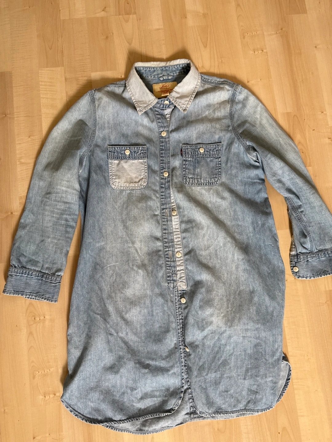 Features two front pockets, button-up closure. Made of a soft denim material, great to wear on a lazy Sunday.