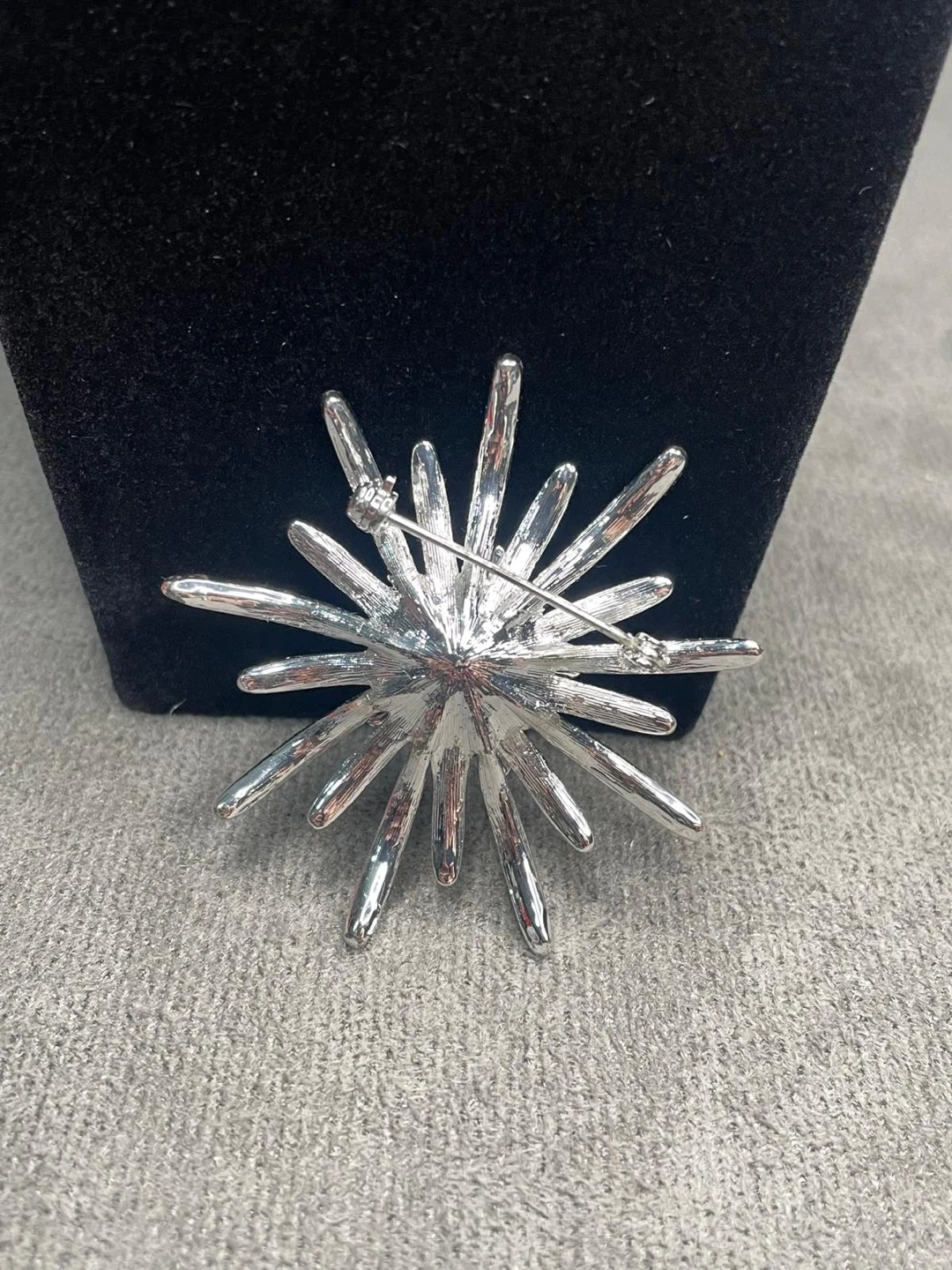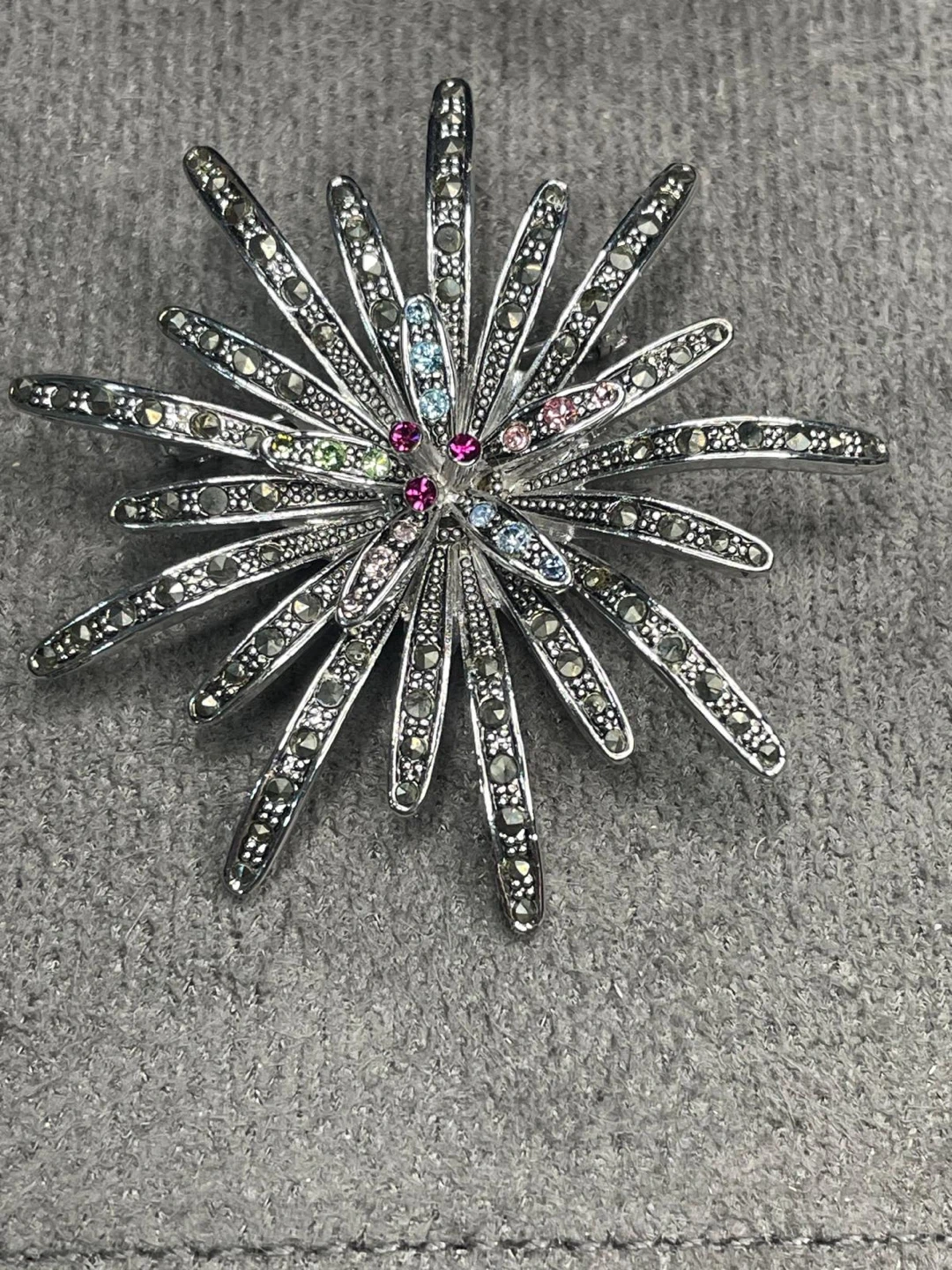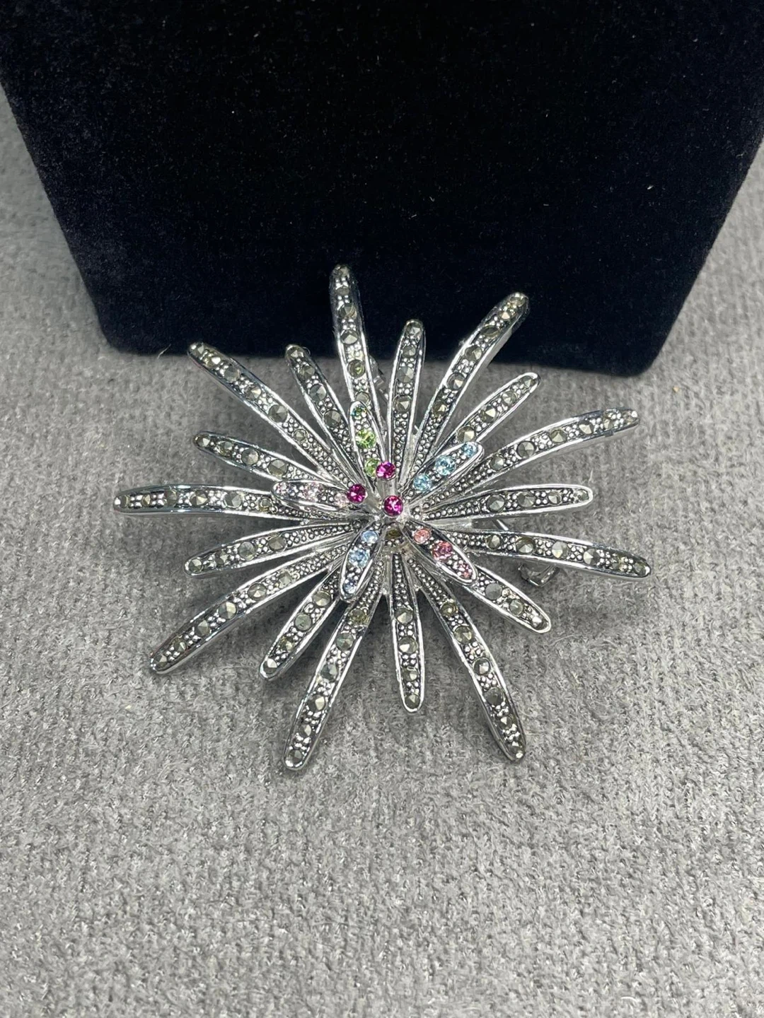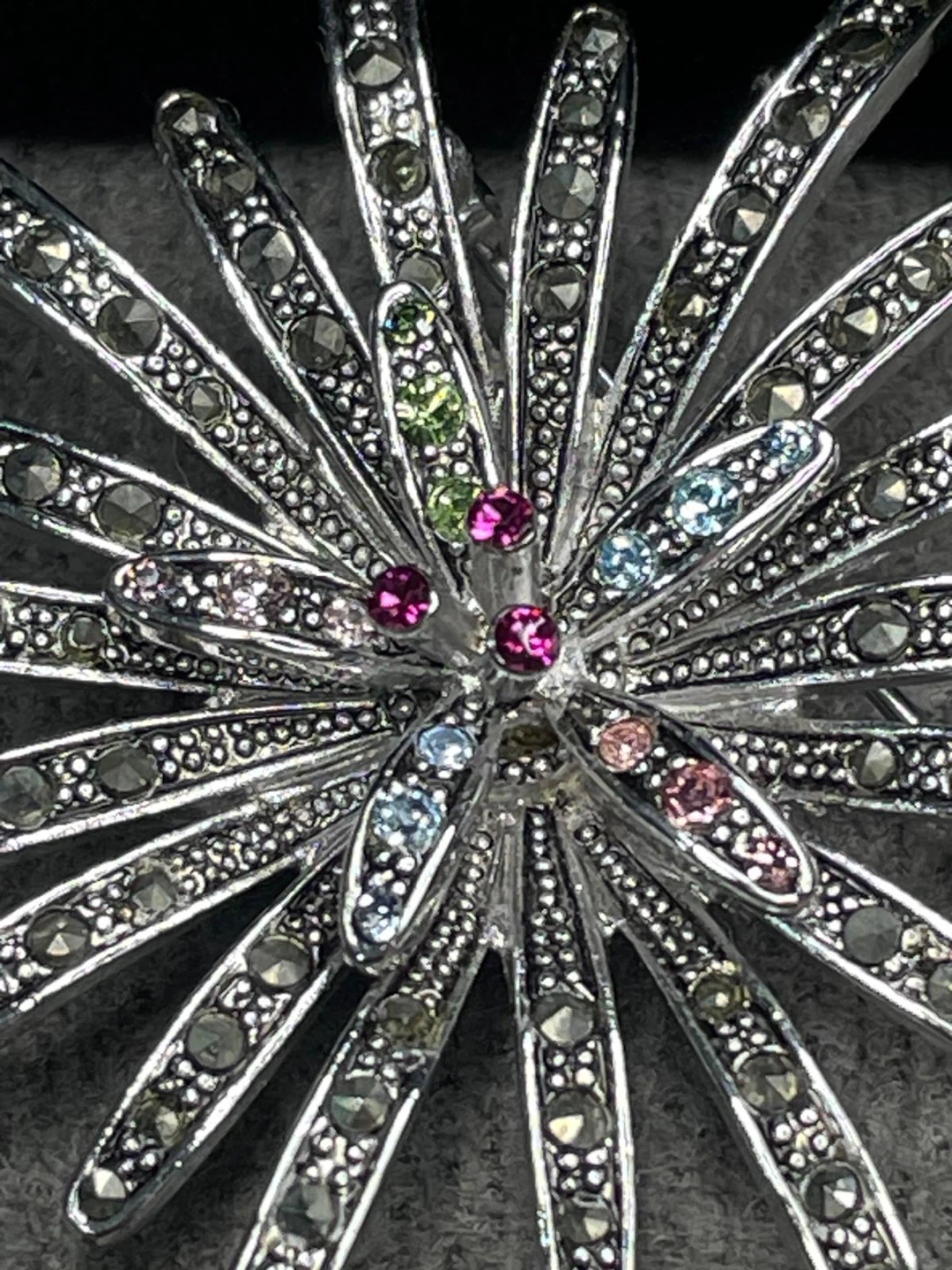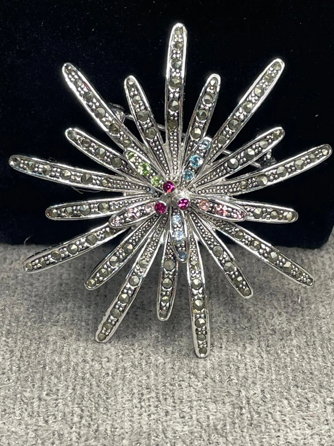 Sparkling silver-toned starburst brooch! It's adorned with small clear, blue, pink, and green gemstones. A lovely statement piece for any outfit.