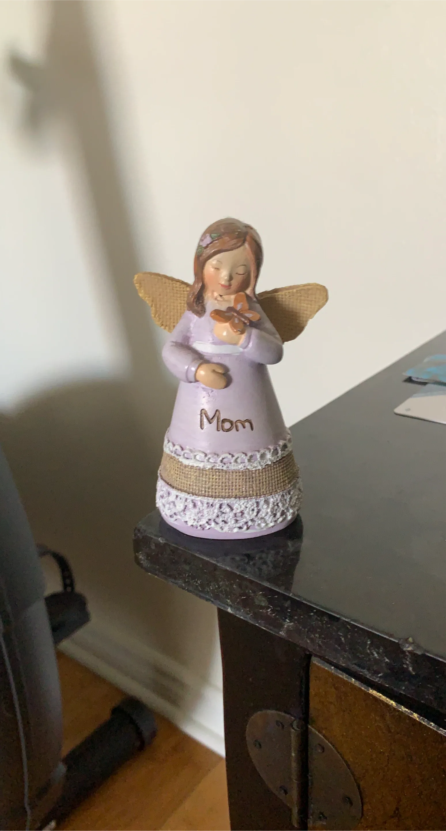 A sweet little angel figurine perfect for showing some love! It's a light purple colour and has the word 'Mom' on the front. It would look great on a shelf or desk