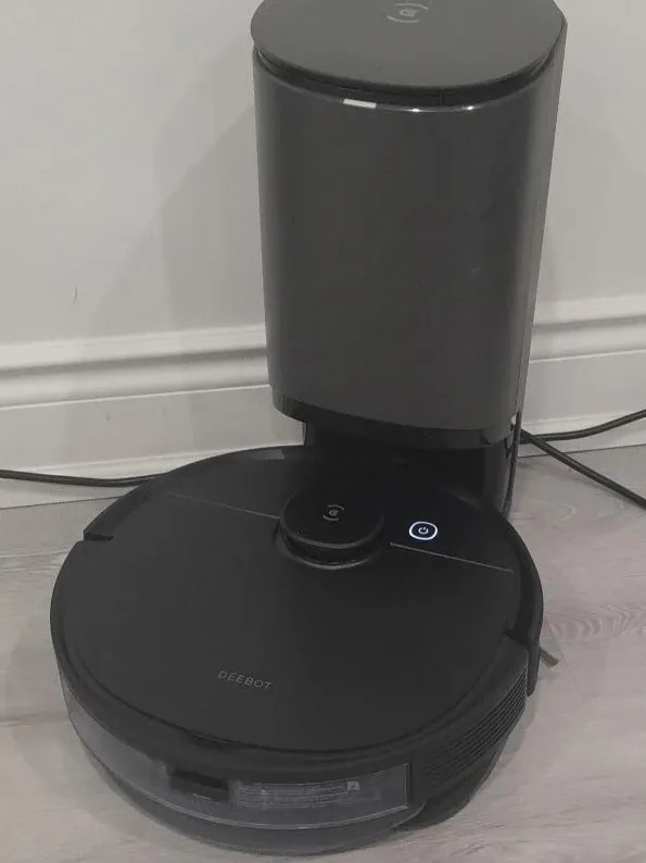 This ECOVACS DEEBOT robotic vacuum cleaner comes with an auto-empty station. It features TrueMapping technology for efficient navigation. The vacuum has a rotating brush and a mopping pad for thorough cleaning. It's designed to keep floors clean automatically.