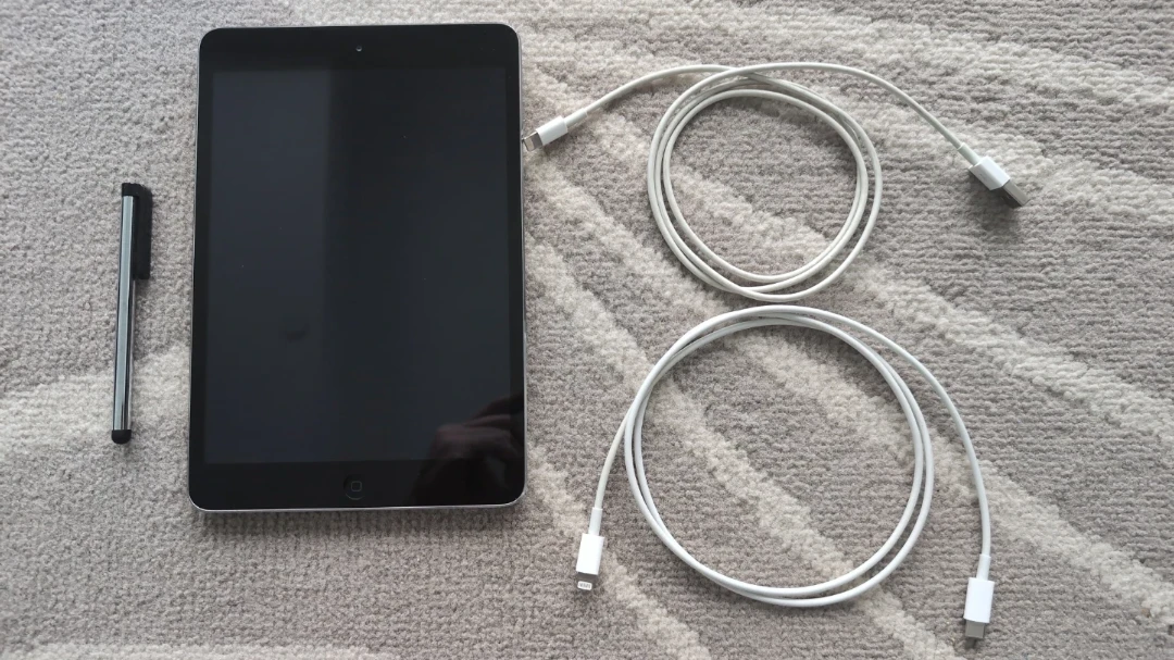 Apple iPad Mini 2 tablet in silver. Includes a stylus and two charging cables Type A to Lightening, and Type C to Lightening. Great for watching movies, streaming Netflix, Amazon Prime, Disney, etc.. Use it for Notes Taking or scribbling and drawing.