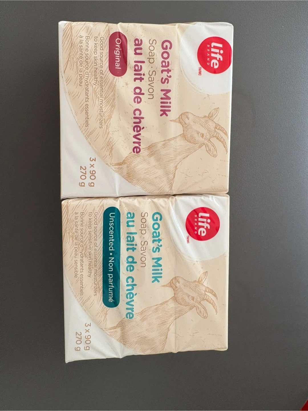 This listing includes two packs of Life Brand Goat's Milk soap. One pack is Original, and the other is Unscented. Each pack contains 3 bars, with each bar weighing 90g, for a total of 270g per pack. They're a good source of essential moisturizers to keep skin healthy.
