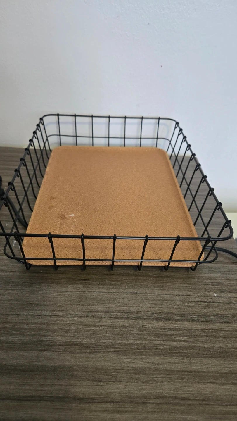 Selling a black wire basket with a cork bottom insert. It's in great condition for desktop organization