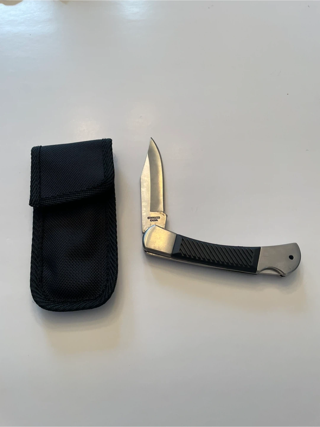 This is a stainless steel folding pocket knife. It features a black ribbed handle and comes with a black nylon pouch for easy carrying. It's useful for everyday tasks and outdoor activities.