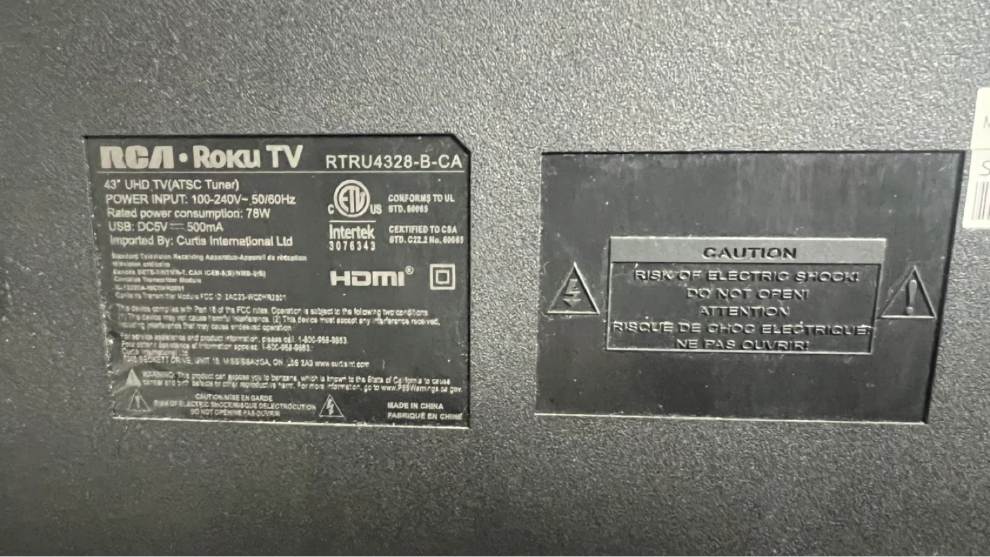 Selling a 43-inch RCA Roku Smart TV (model RTRU4328-B-CA) in great working condition, comes with a sturdy stand.