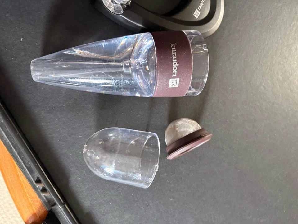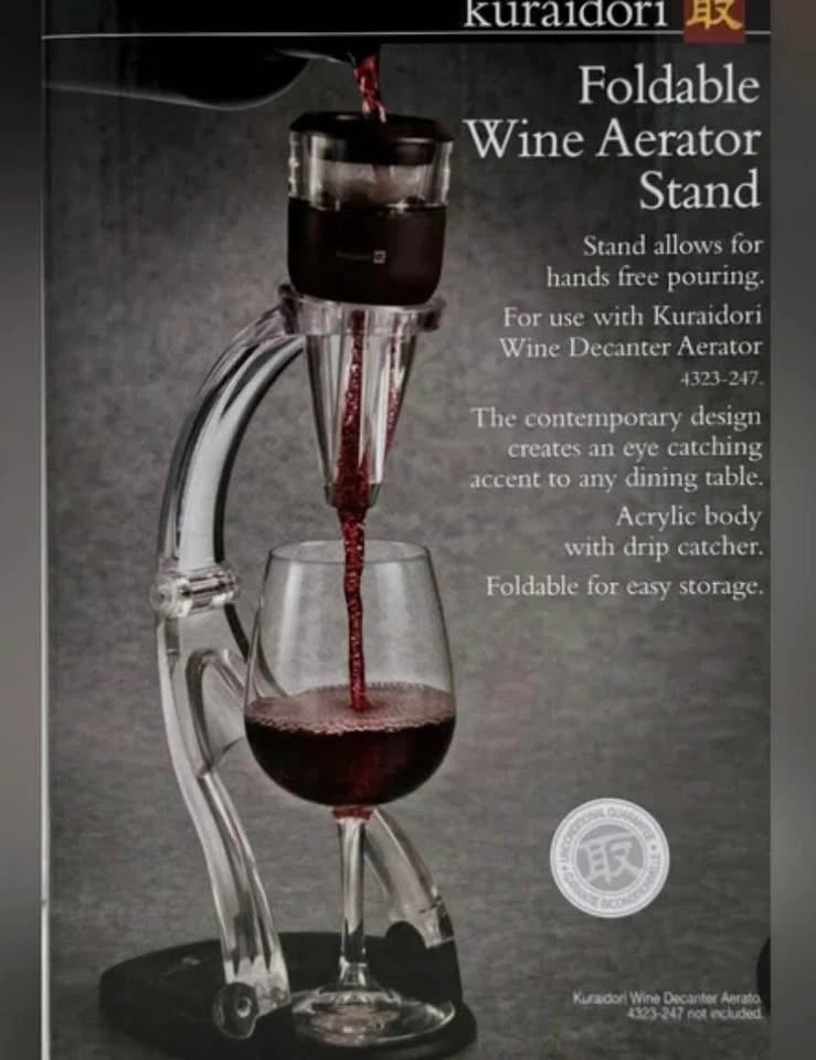 This Kuraidori Wine Aerator Stand is a popular accessory designed to hold a wine aerator for hands-free, drip-free pouring, enhancing wine's flavor and aroma. It features a foldable design for easy storage, durable construction, and a sleek black/clear aesthetic, making it a functional and stylish bar tool.