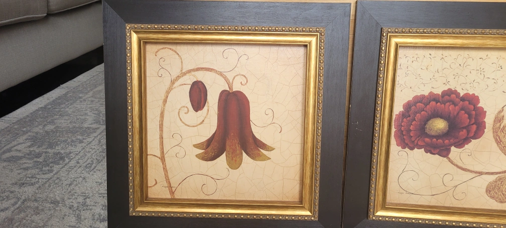 Set of two framed prints. Floral designs. Dark brown frames with gold inner accents. Cream coloured background. Perfect for adding a touch of elegance to your home.